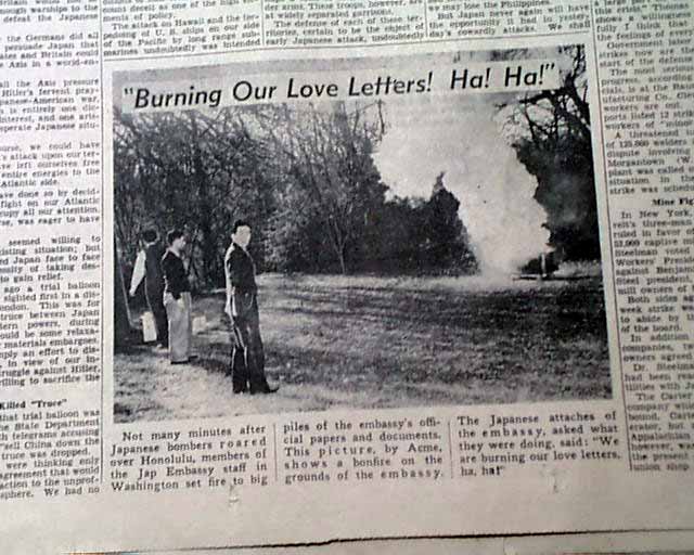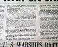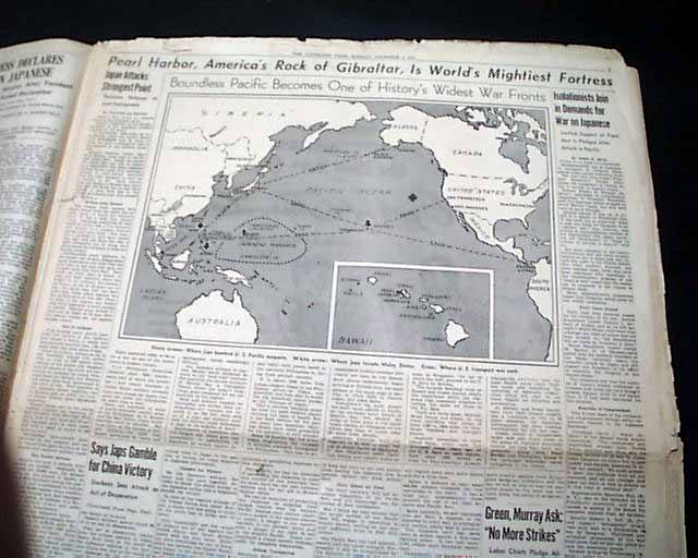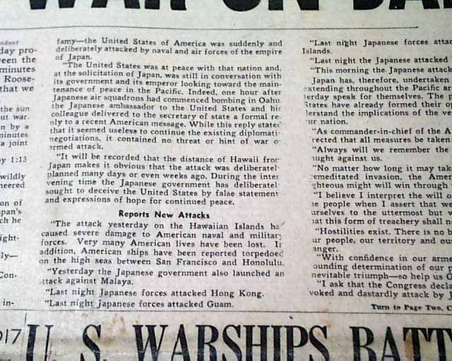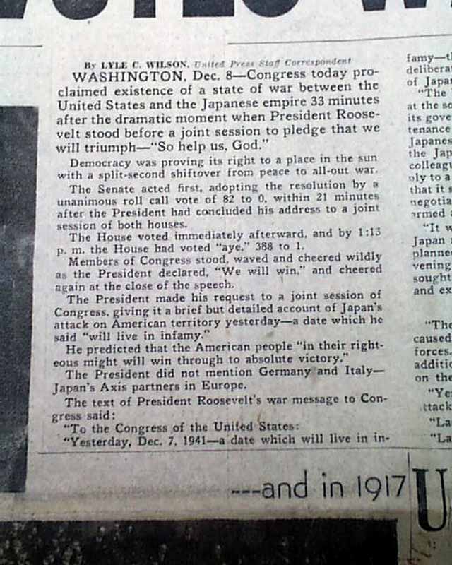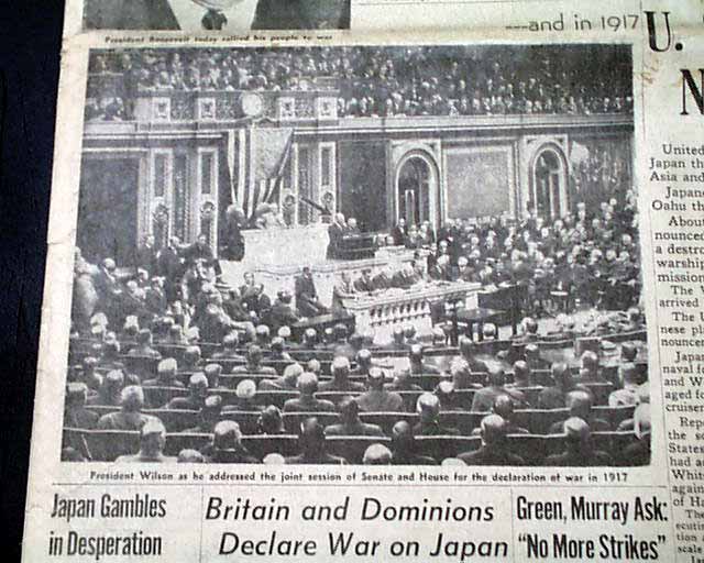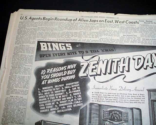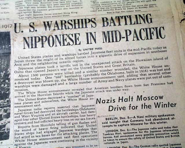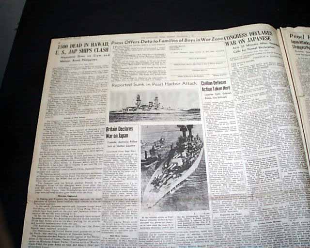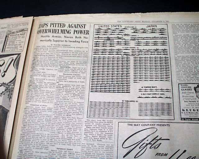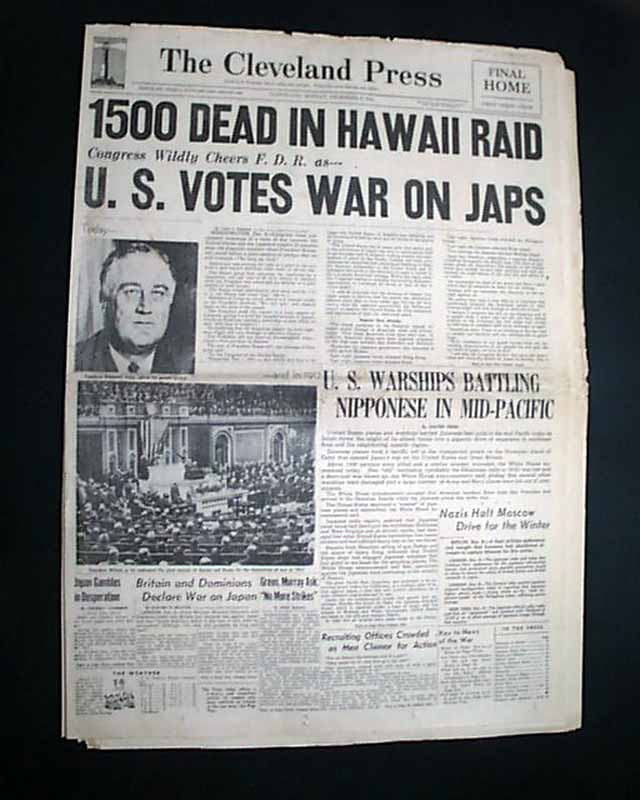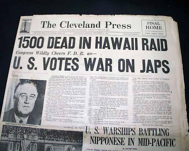THE CLEVELAND PRESS, Ohio, Dec. 8, 1941 Nice banner headlines on the bombing of Pearl Harbor, plus America's entry into World War II: "1500 DEAD IN HAWAII RAID" "Congress Wildly Cheers F. D. R. As...U.S. VOTES WAR ON JAPS".