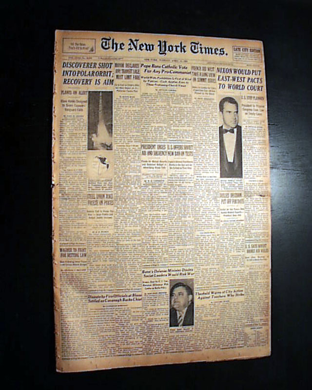 The top of the front page has a two column headline: "DISCOVERER SHOT INTO POLAR ORBIT; RECOVERY IS AIM" with subheads and related photo. (see images)