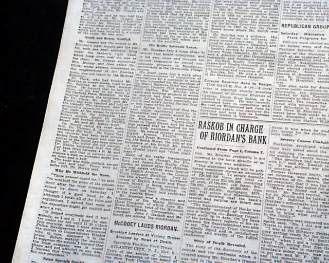 The top of the front page has a two column headline: "J. J. RIORDAN ENDS LIFE WITH PISTOL IN HIS HOME; HIS BANK DECLARED SOUND" with subheads. More on page 2 with photo of Riordan. Nice to have in the NYC publication.