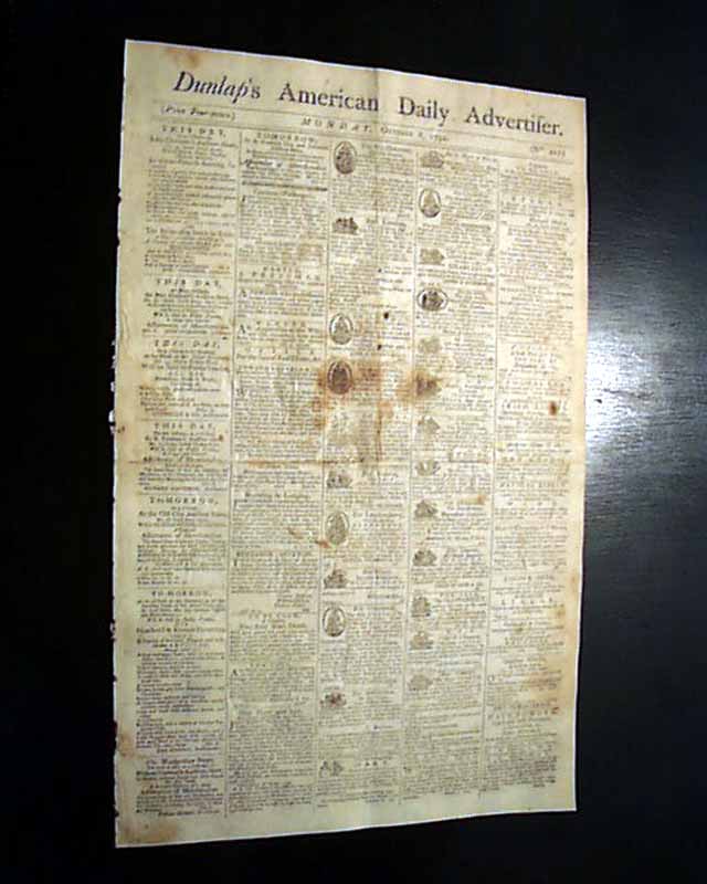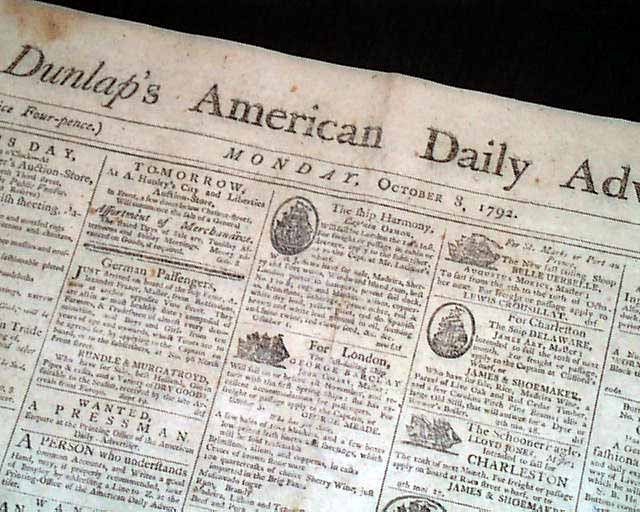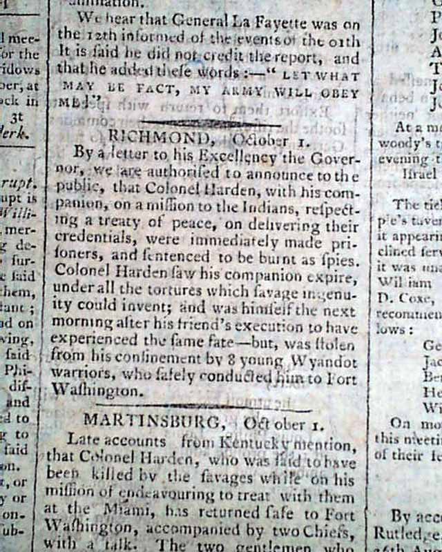 DUNLAP'S AMERICAN DAILY ADVERTISER, Philadelphia, Oct. 8, 1792 The front page features 24 illustrated ship ads. Page 2 has a report: "...that Colonel Harden...on a mission to the Indians respecting a treaty of peace...were immediately made prisoners & sentenced to be burnt as spies. Colonel Harden saw his companion expire under all the tortures which savage ingenuity could invent; and was himself the next morning after his friend's execution to have experienced the same fate--but was stolen from his confinement by 8 young Wyandot warriors who lately conducted him to Fort Washington." followed by a related account.