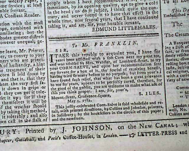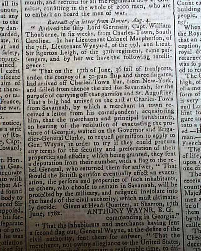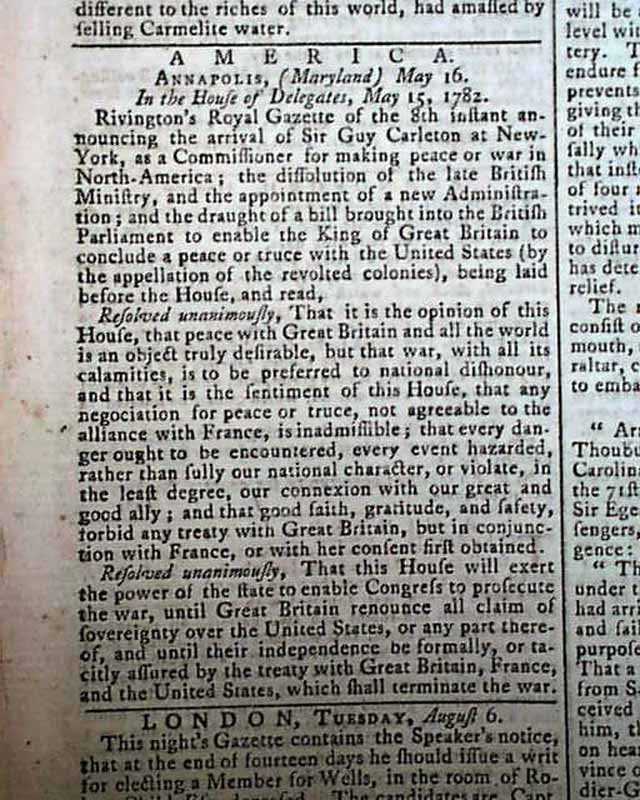 THE SALISBURY & WINCHESTER JOURNAL, England, Aug. 12, 1782 Very ornate & decorative lettering in the masthead. The front page has: "America" with a report from Annapolis noting: "Rivington's Royal Gazette...announcing the arrival of Sir Guy Carleton at New York as a commissioner for making peace or war in North America...and the draught of a bill brought into the British Parliament to enable the King of Great Britain to conclude a peace or truce with the United States..." followed by a Resolution.