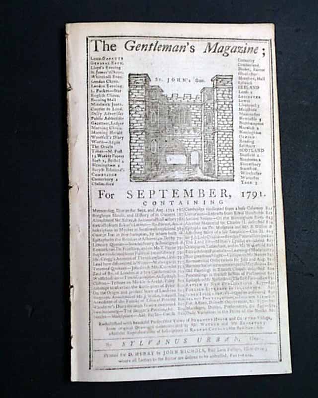 Item # 714580 GENTLEMAN'S MAGAZINE, London, September, 1791 Perhaps the highlight would be the 3 full page plates which are still present. One shows a rural setting with an elegant house, captioned: "S. E. View of Burghope House, Herefordshire". Another is a very nice: "View of Clifton Near Bristol, from a Drawing in the Collection of the Rev. Mr. Elderton".