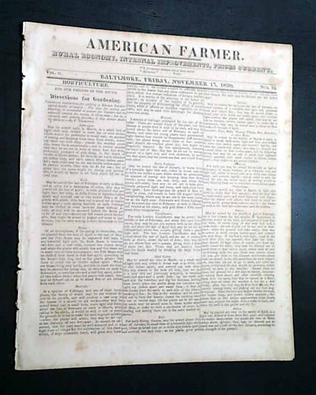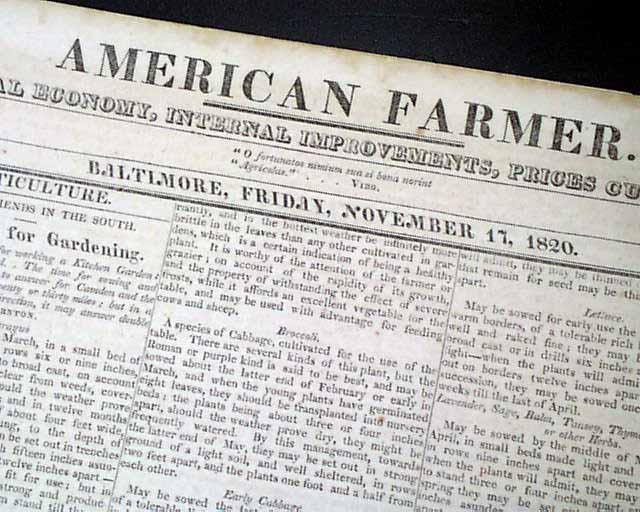 AMERICAN FARMER, Baltimore, Maryland, Nov. 17, 1820 Subtitled: "Rural Economy, Internal Improvements, Prices Current" which pretty much describes the content within.