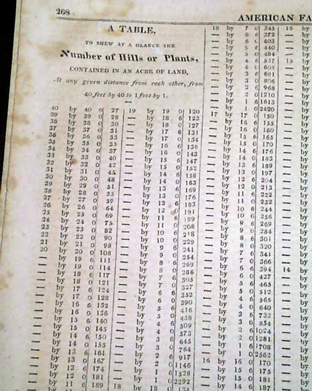 One article: "Manner of Preserving Eggs Perfectly Fresh for 12 Months". Nearly 2 pages are taken up with a huge: "Table to Shew At a Glance the Number of Hills or Plants Contained in an Acre of Land".