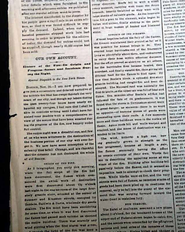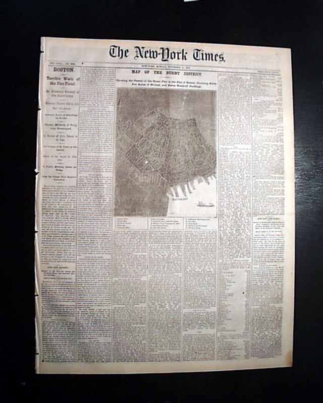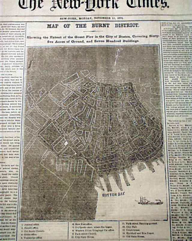 NEW YORK TIMES, Nov. 11, 1872 The front page is dominated by a very nice & large: "MAP OF THE BURNT DISTRICT. Showing the Extend of the Great Fire in the City of Boston, Covering 65 Acres of Ground and 700 Buildings."