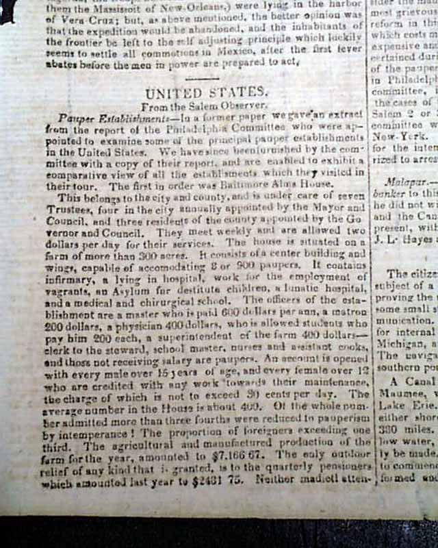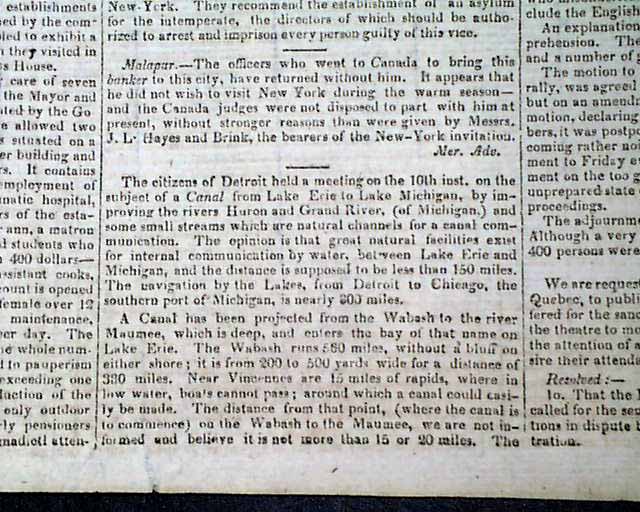 The front page has a letter headed: "Desperate Pirate". Page 3 has more than a column headed: "United States" with various reports, including one noting a meeting: "...on the subject of a canal from Lake Erie to Lake Michigan by improving the rivers Huron and Grand River (of Michigan) and some small streams..." with more.