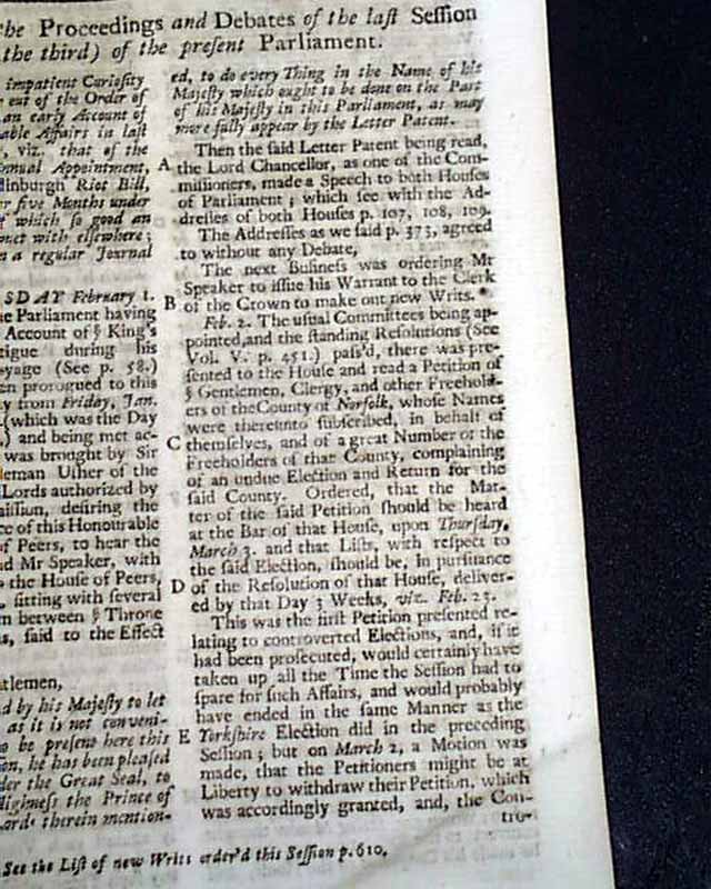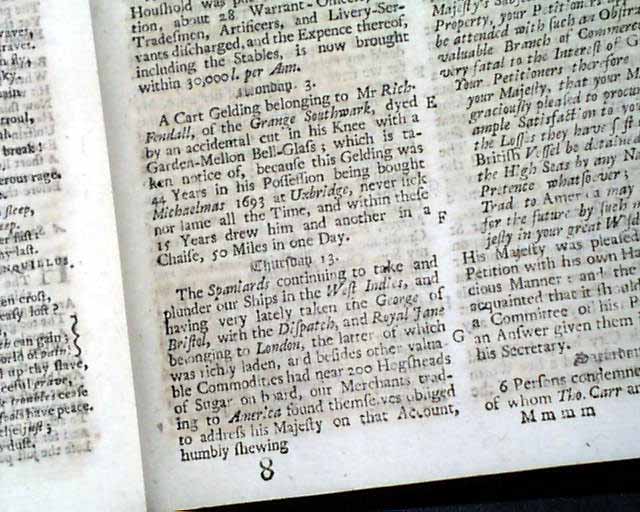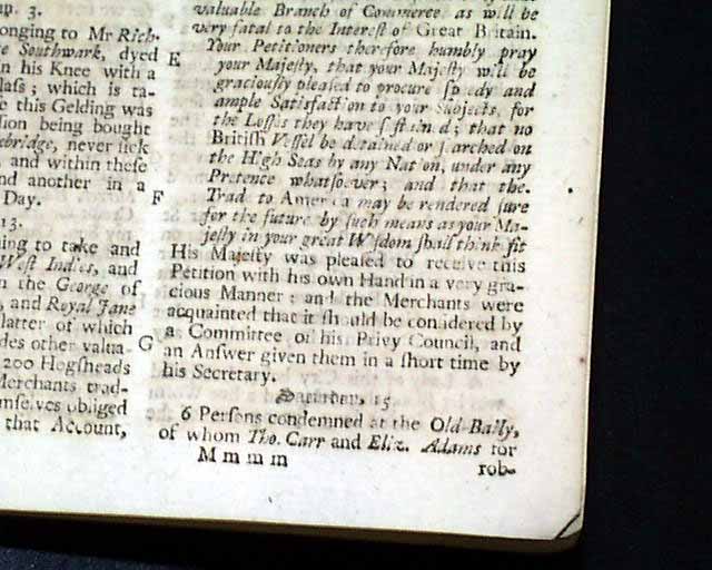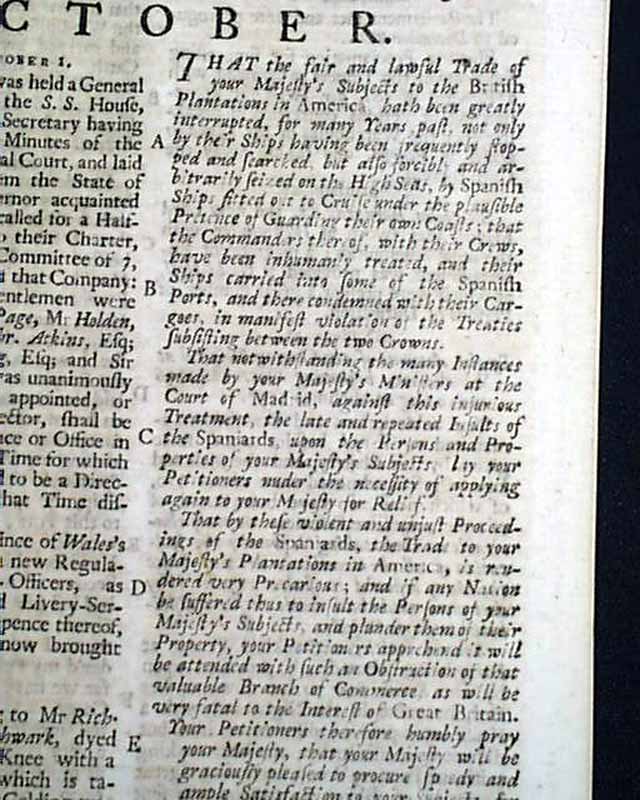 Near the back is a section headed: "Historical Chronicle" with news from England & other parts of Europe. Included is a report which discusses the problem with pirates in the Caribbean, with the article containing: "The Spaniards continuing to take & plunder our ships in the West Indies, & having very lately taken the George...our merchants trading to America found themselves obliged to address his Majesty on that account...the fair & lawful trade of your Majesty's subjects to the British Plantations in America hath been greatly interrupted...not only by their ships having been frequently stopped & searched but also forcibly & arbitrarily seized on the High Seas..." with more.