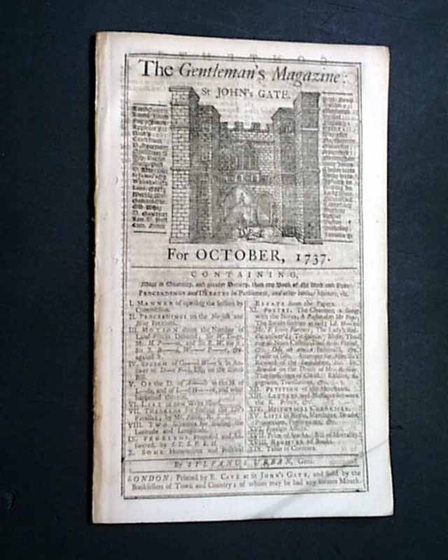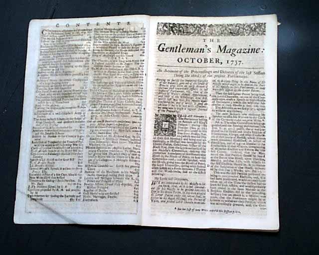 Item # 714635 THE GENTLEMAN'S MAGAZINE, London, October, 1737 Among the articles noted in the table of contents are: "Some regular Troops necessary in a free Government against Civil Insurrections" "Tumults, How Best Suppressed" "Arbitrary Power the Consequence of Popery and the Jacobite Scheme" and more.