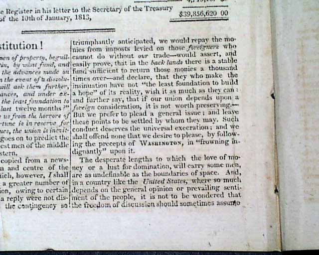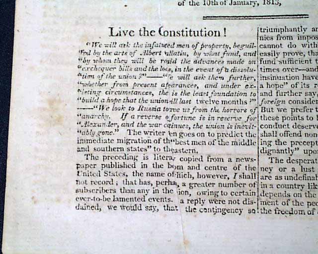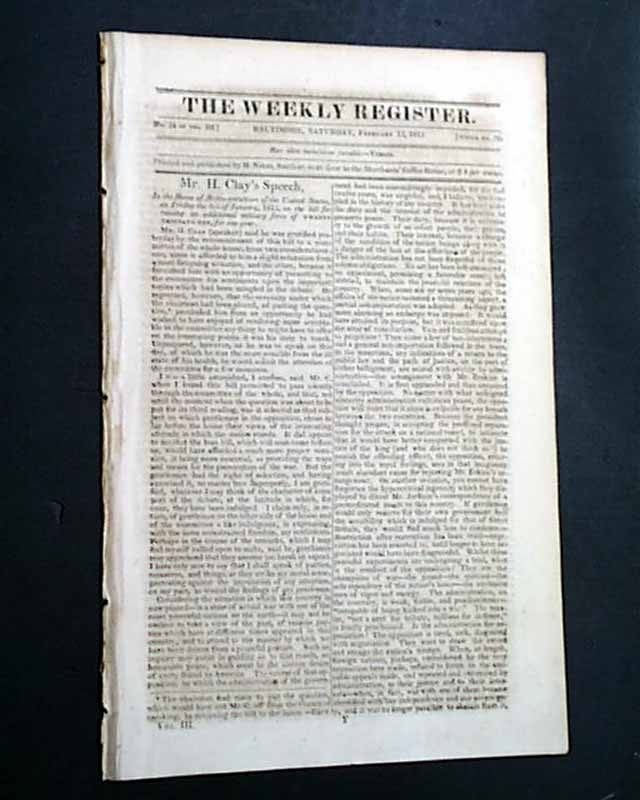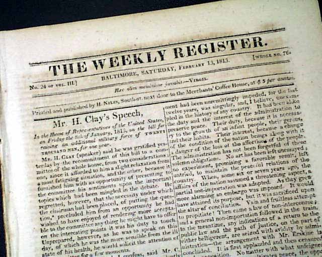 THE WEEKLY REGISTER, Baltimore, Feb. 13, 1813  Inside has; "Law of Ohio - An Act for the Encouragement of Volunteers in the North-Western Army of the United States"; a lengthy piece headed: "Live the Constitution" and over two pages under the heading: "Events of the War".