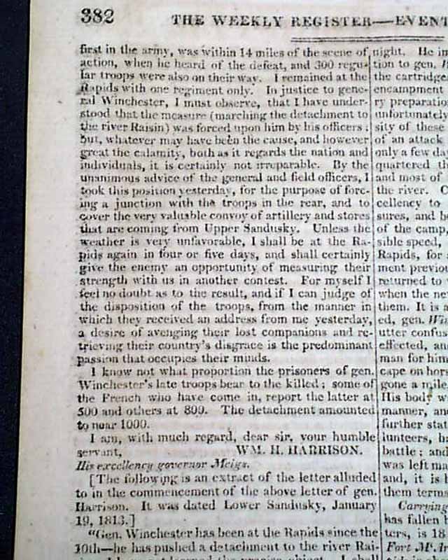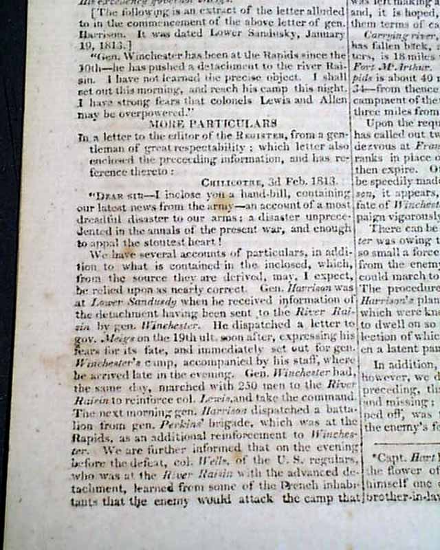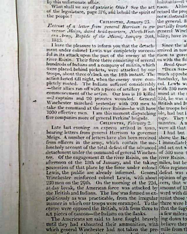 Among the subheads is: "North-Western Army" which includes a letter from General Harrison to Governor Meigs, datelined at Chillicothe, signed in type: Wm. H. Harrison. This is followed by: "More Particulars" with another letter from Chilicothe, and then "American Prizes" and "Proceedings of Congress".