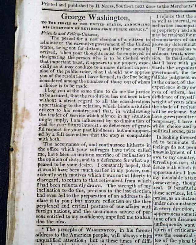 Also of interest in this issue is a printing of George Washington's farewell address to the people of the United States, taking all of pages 1, 2 and 3, continuing in a future issue. This was his address from 1796.