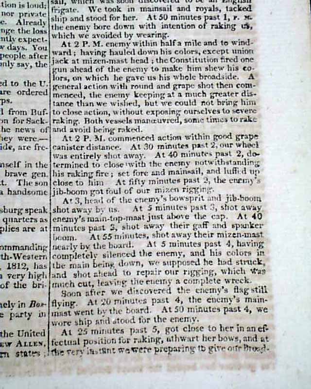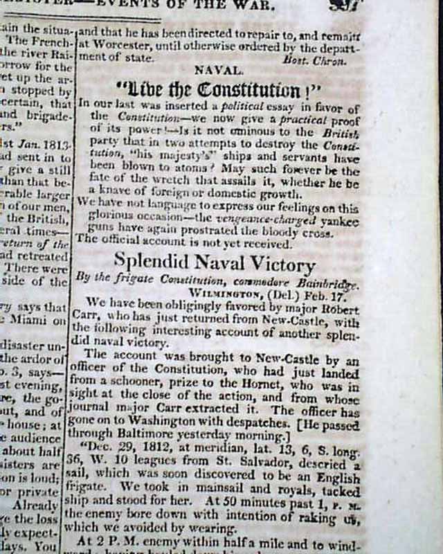 The article is headed: "Splendid Naval Victory, by the Frigate Constitution, commodore Bainbridge" with the text beginning: "We have been obligingly favored by major Robert Carr...with the following interesting account of another splendid naval victory..." and what follows is a detailed account of the battle, carrying over to the following page. This is followed by other military reports concerning the War of 1812.