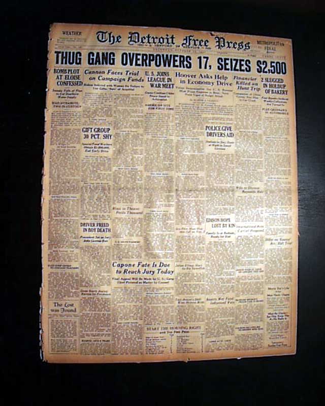 The front page has a two column heading: "Capone Fate Is Due to Reach Jury Today" with subheads. (see) Edison would die on the following day. Coverage on the day he would be found guilty of tax evasion.