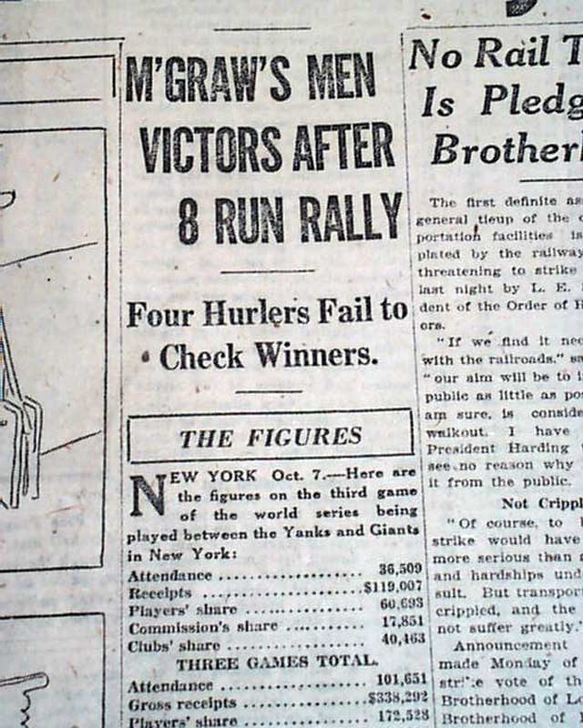 The front page has a nice banner headline: "GIANTS BEAT YANKEES, 13-5" with subheads and revenue figures. (see images) Nice for display. More in the sport's section with box scores and two related photos. This was game 3 of the 1921 World Series.