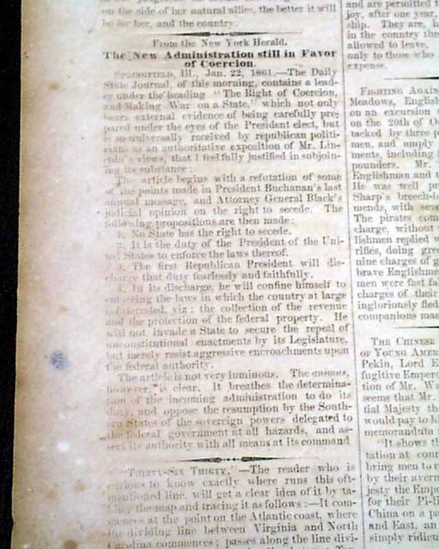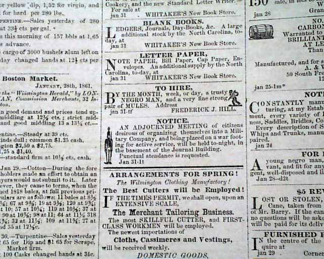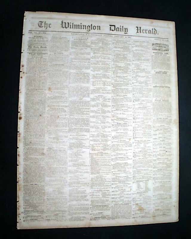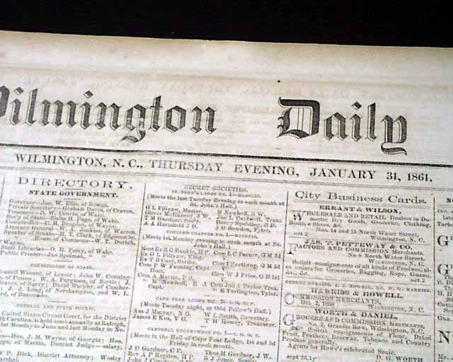 THE WILMINGTON DAILY HERALD, North Carolina, Jan. 31, 1861  From this Southern port city from shortly before the outbreak of the Civil War. This was the last Confederate port city to fall to the Yankees when it did so in February, 1865, completing its blockage of the Atlantic coast.