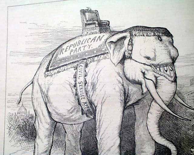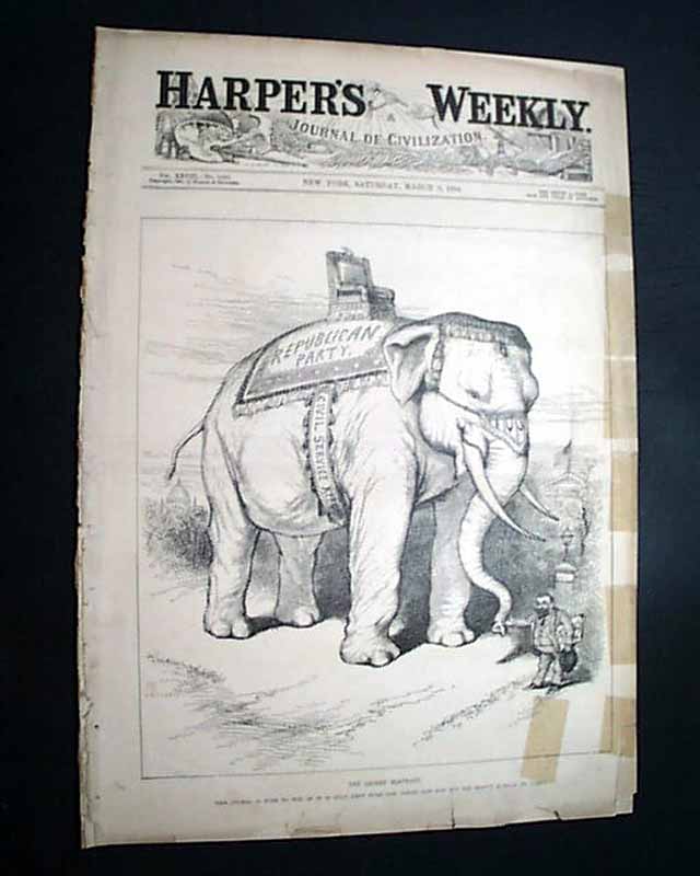 HARPER'S WEEKLY, New York, March 8, 1884 For a political junkie--and a Republican--this could be the best Harper's Weekly for display as the entire front page print is captioned: "The Sacred Elephant. This Animal Is Sure To Win, If It Is Only Kept Pure And Clean, And Has Not Too Heavy A Load To Carry."
