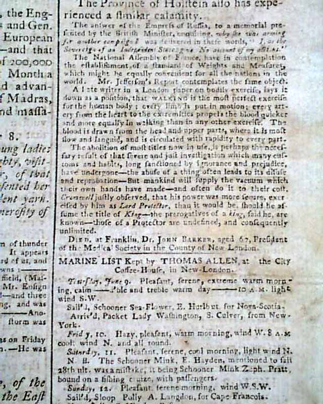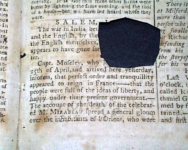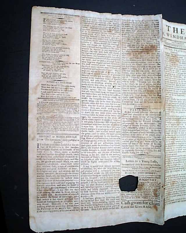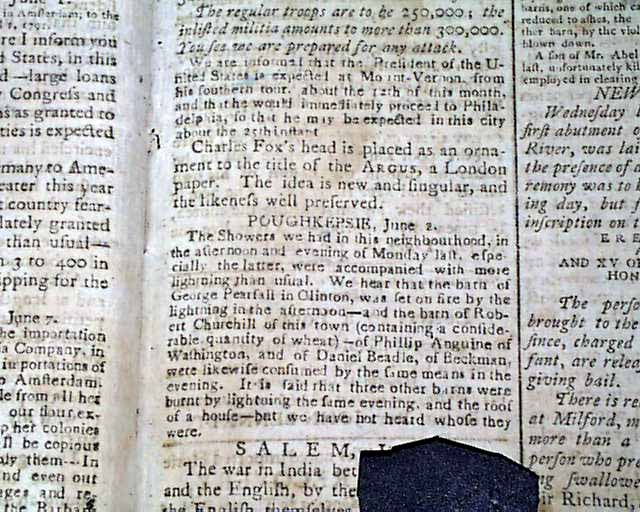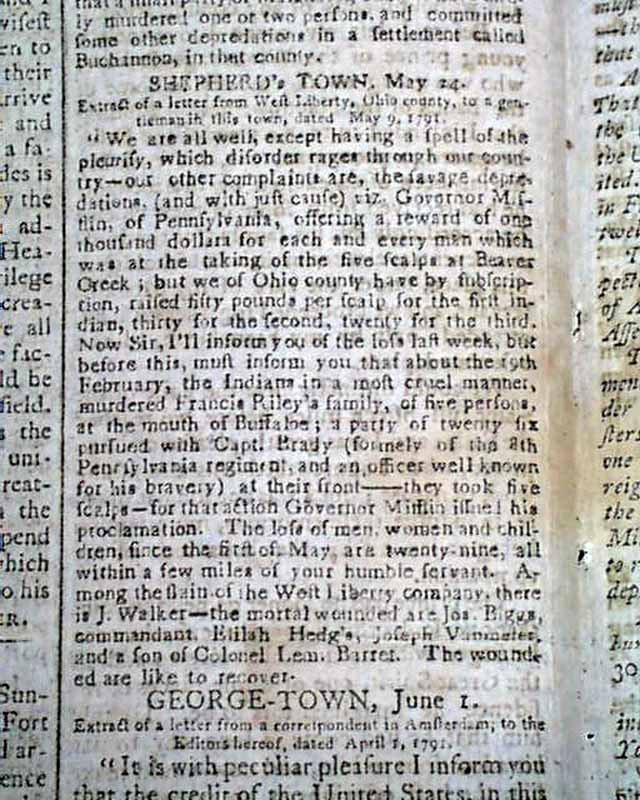 Page 2 has a report concerning the Riley family murder by Indians, about which much can be found on the web. Page 3 has mention that: "...the President of the United States is expected at Mount Vernon from his southern tour..." and some reports concerning events of the French Revolution with mention of Thomas Jefferson.