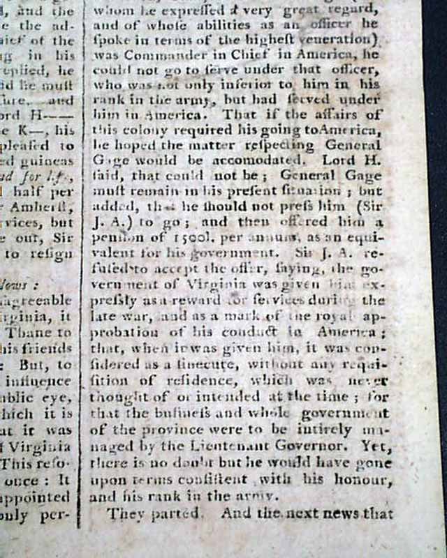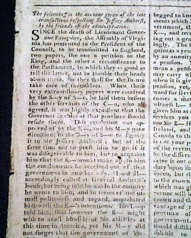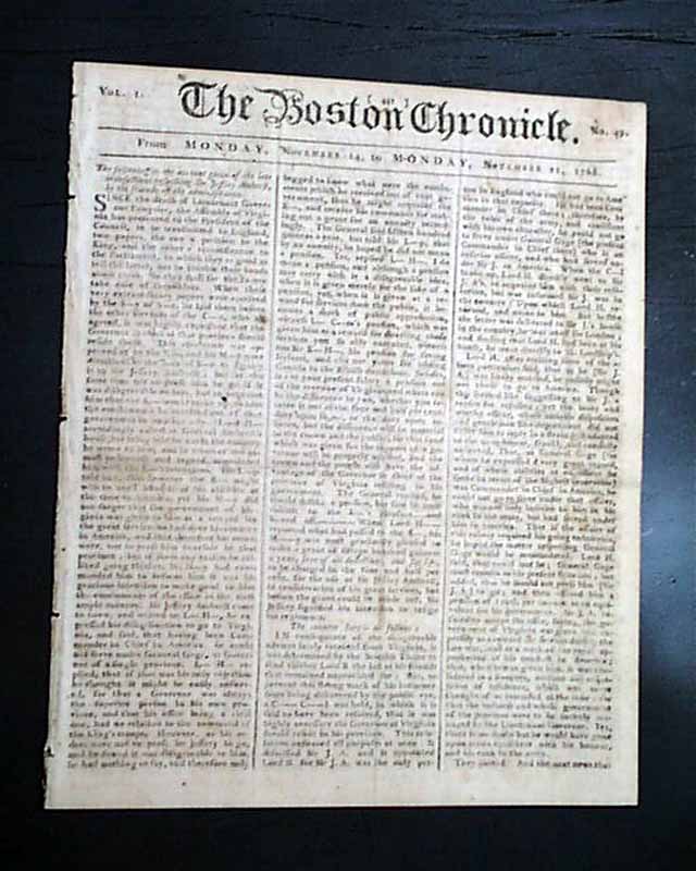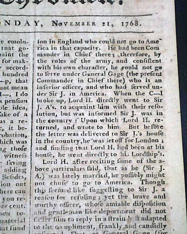 THE BOSTON CHRONICLE, Nov. 21, 1768 The front page is entirely taken up with "...the account given of the late transactions respecting Sir Jeffery Amherst by the friends of the administration." with much on the relationship with General Gage.