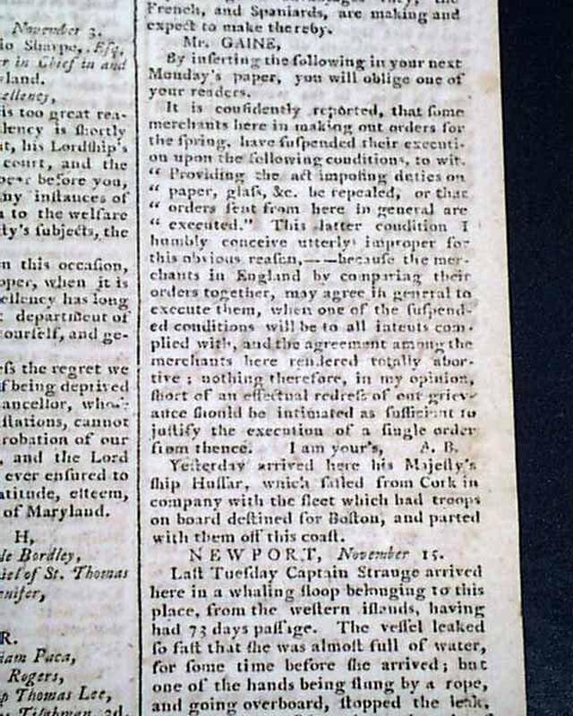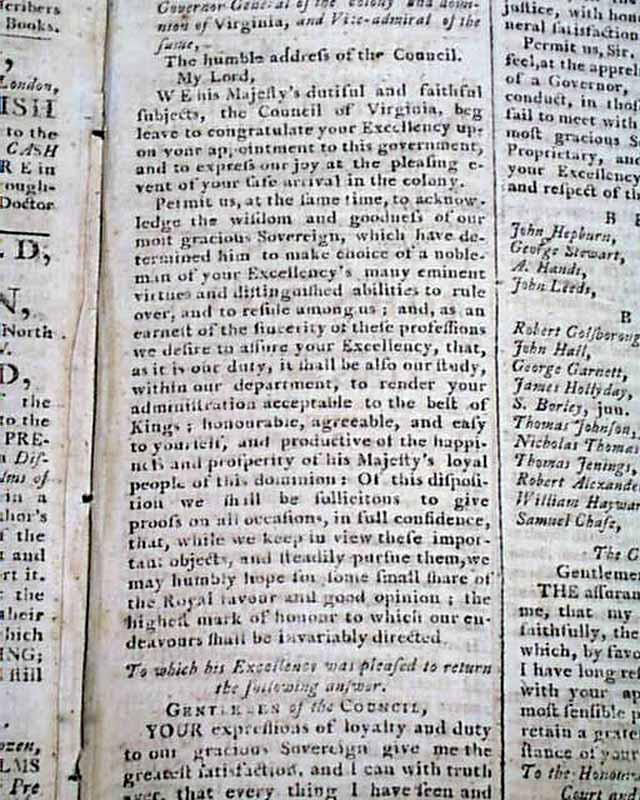Pages 2 & 3 have various reports on the events in Corsica & elsewhere in Europe. Page 7 has items from Williamsburg, Virginia, including a note beginning: "We his Majesty's dutiful & faithful subjects, the Council of Virginia, beg leave to congratulate your Excellency upon your appointment to this government..." with the response. Also a letter to the governor of Maryland, and a report which includes: "...have suspended their execution upon the following conditions, to wit 'Providing the act imposing duties on paper, glass, etc. be repealed, or that orders sent from here in general are executed..." with more.
