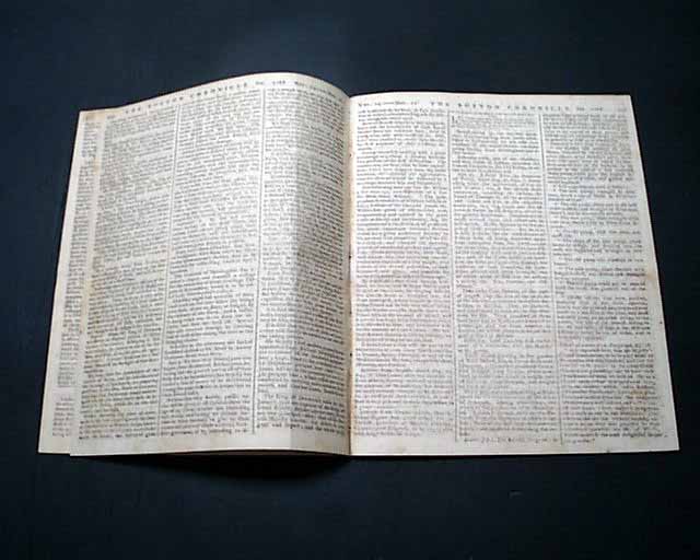 This newspaper published only briefly from December 21, 1767 until 1770. The publishers, John Mein and John Fleeming, were both from Scotland. The Chronicle was a Loyalist paper in the time before the American Revolution. In its second year, Mein printed names in the paper that accused some colonial merchants of breaking a British non-importation agreement. In response, Mein's name appeared on a list of merchants who violated the trade agreement. Mein retaliated by accusing the Merchants' Committee of using the non-importation agreement for illegal profiteering. The irritated readership ransacked the offices of the Chronicle, and ultimately, it ceased operations in 1770. (credit Wikipedia)