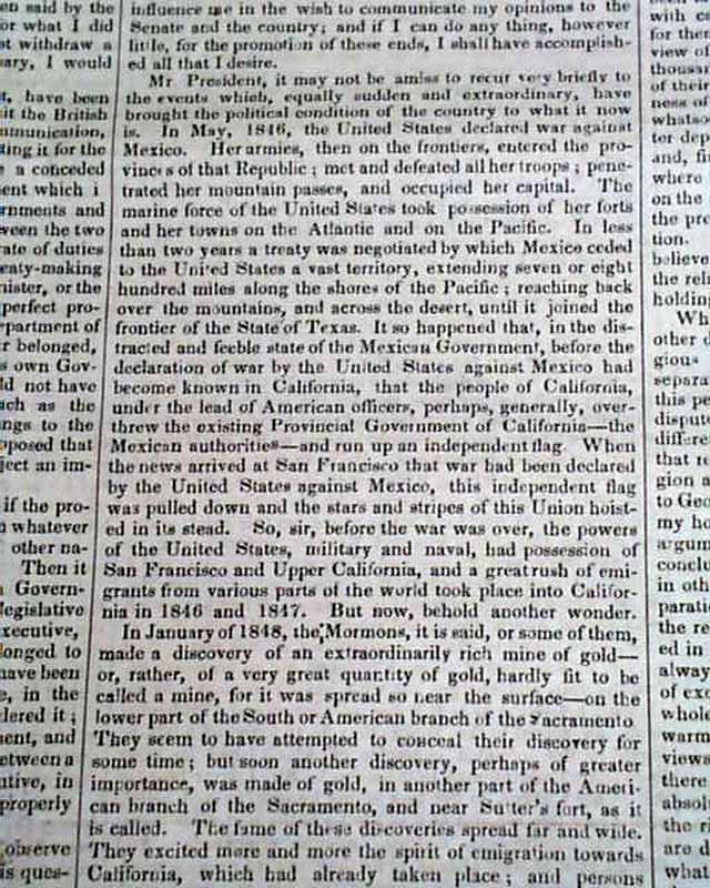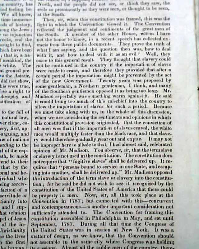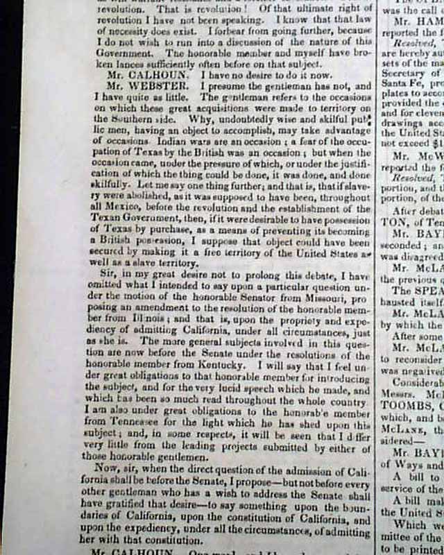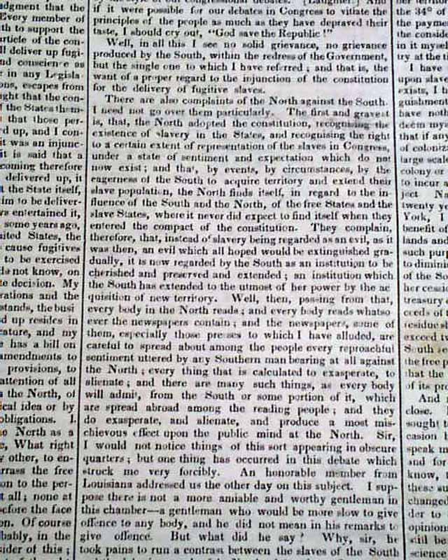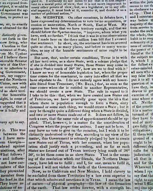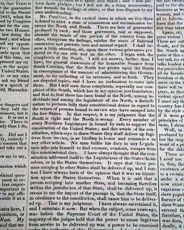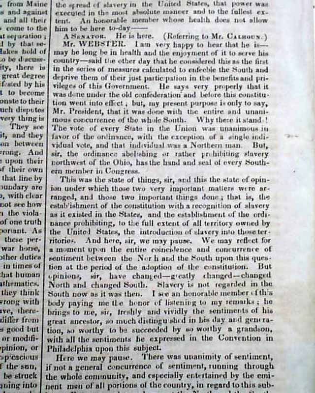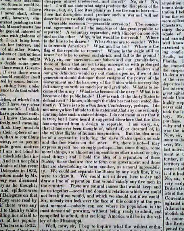 Starting on page 2 and continuing on pages 3 and 4 is the full text of Daniel Webster's pivotal, historic, "March 7th Speech" before Congress. An excerpt includes: "I wish to speak today, not as a Massachusetts man, nor as a Northern man, but as an American… I speak today for the preservation of the Union. ‘Hear me for my cause.’ I speak today out of concern for the whole country. I speak today for the Constitution and the Union, which are threatened. I speak today against disunion—with all my heart and soul."