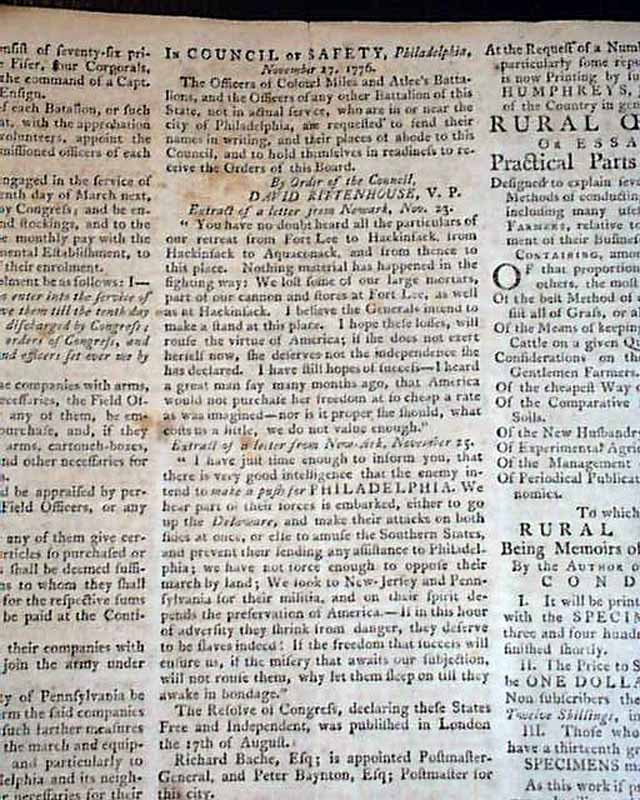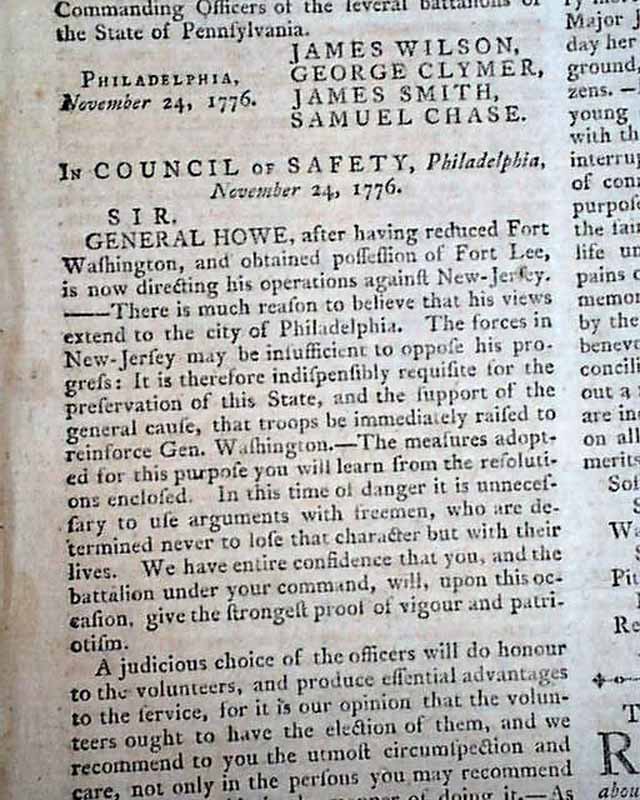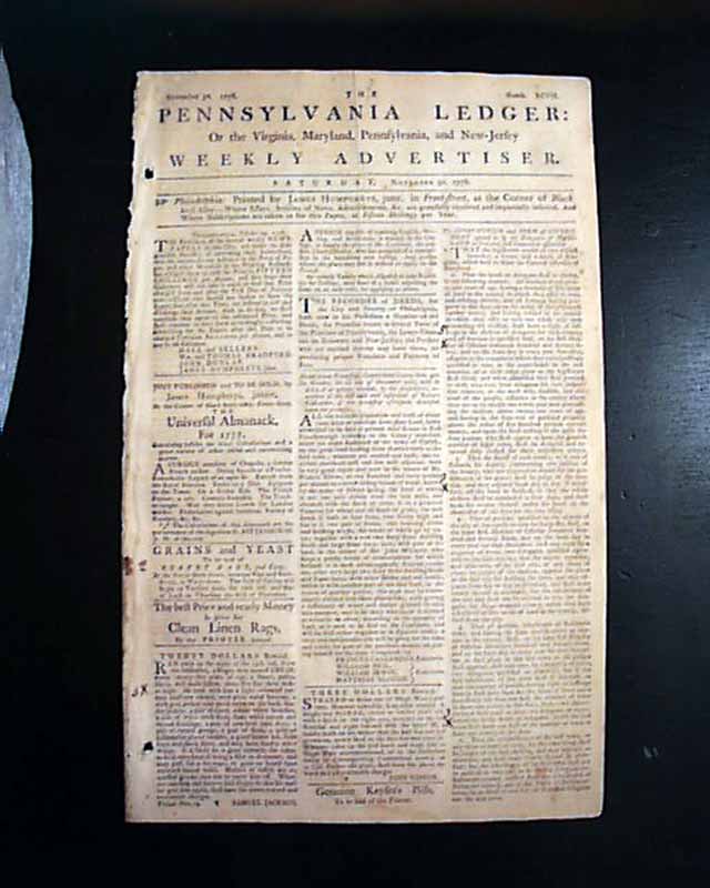 THE PENNSYLVANIA LEDGER, Philadelphia, Nov. 30, 1776 (editor's copy) This was a decidedly Tory newspaper, supportive of the British efforts in America. This newspaper ended publication in June, 1778 when the British evacuated the city.