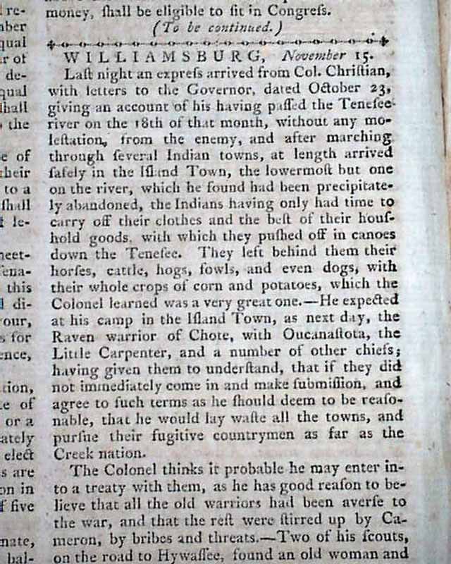The front page has a very detailed "Twenty Dollars Reward" ad for a runaway slave named Caesar. Page 2 has a report concerning an expedition into the western portion of what was then Virginia (Tennessee) and encounters with Indians.