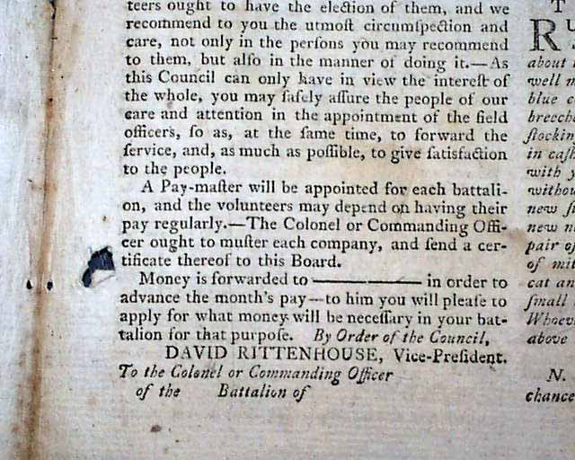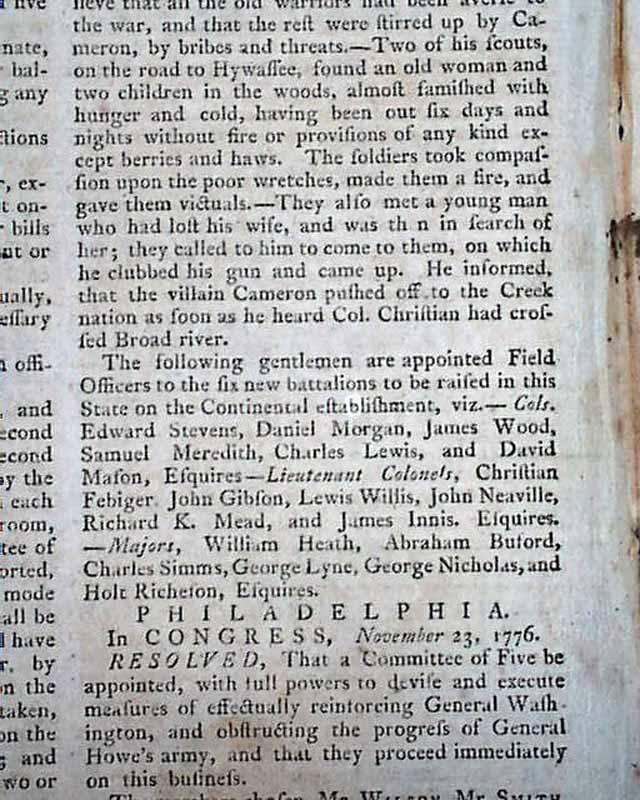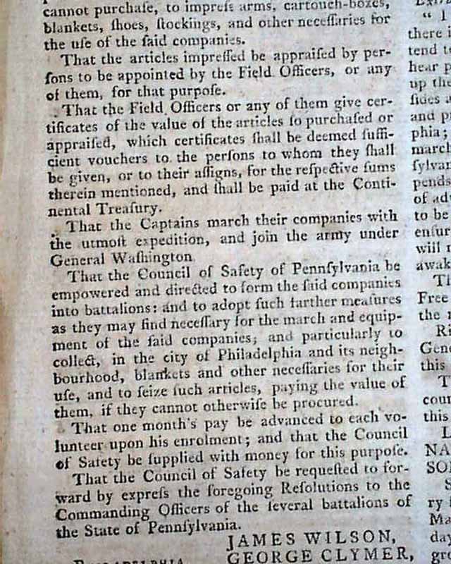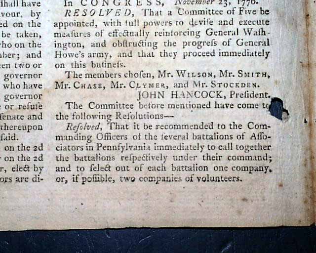 Also a Resolve from Congress reads: "That a Committee of five be appointed with full powers to devise and execute measures of effectually reinforcing General Washington and obstructing the progress of General Howe's army, and that they proceed immediately on this business." signed in type by: John Hancock, with the committee members noted. This is followed by details for creating several battalions of soldiers, noting how to be composed: "...consist of 76 privates, one drummer, one fifer, four corporals, and four sergeants...That the companies be engaged in the service of the United States till the 10th day of March next...be entitled to a pair of shoes and stockings & to the same rations & the same monthly pay with the other troops on the Continental establishment..." with more details, including the oath to be taken by those who enlist.