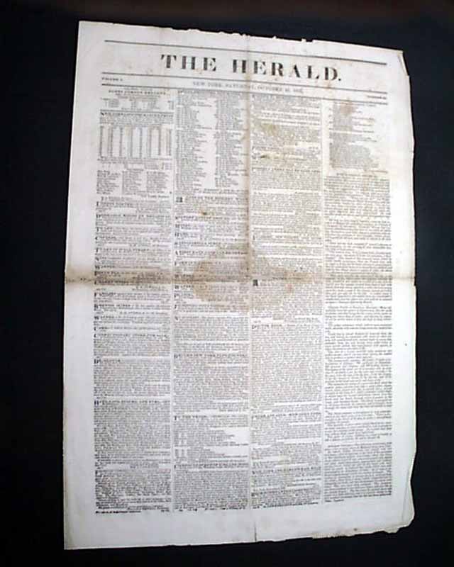 THE HERALD, New York, Oct. 10, 1835  This is one of the earliest issues of James Gordon Bennett's famous newspaper, this being volume 1, number 36. It was of smaller size then (11 1/4 by 16 1/2 in.) and just four pages.