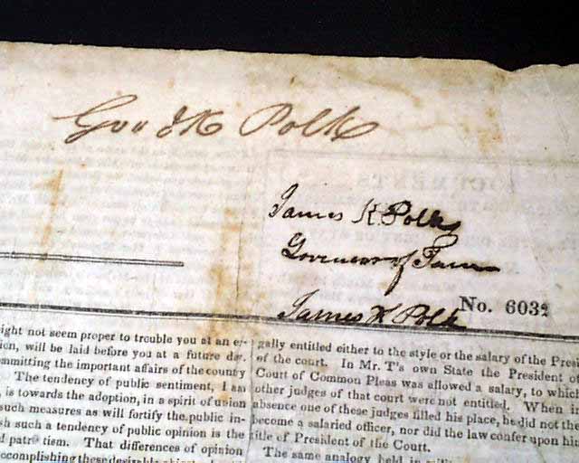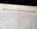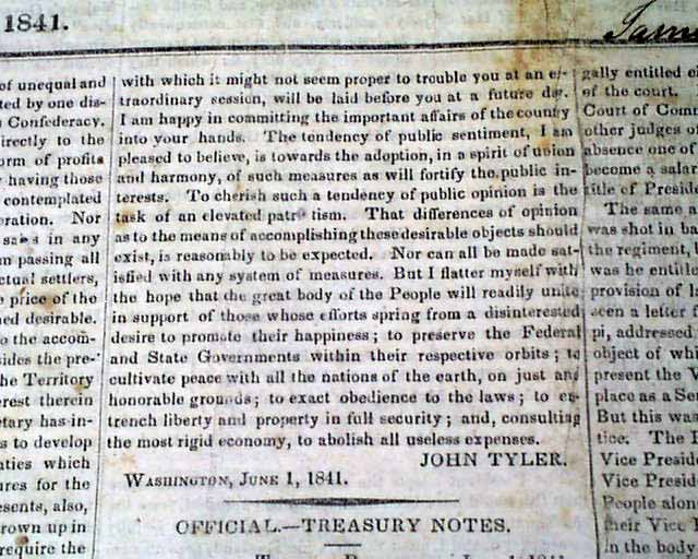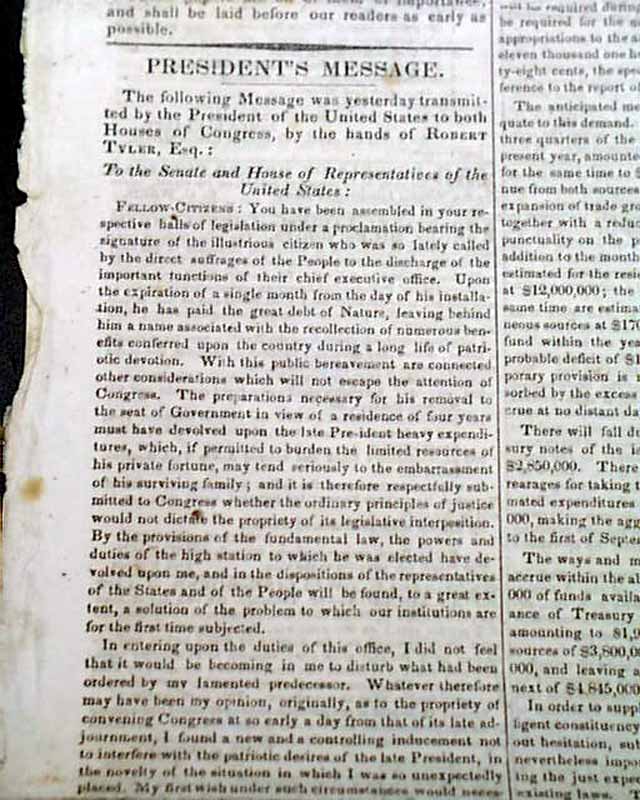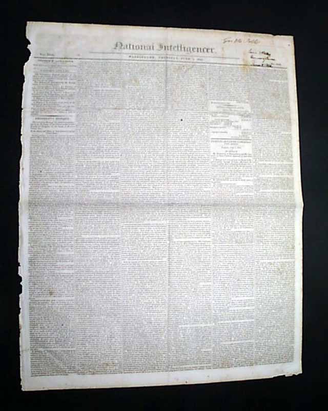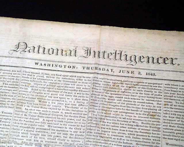 NATIONAL INTELLIGENCER, Washington, D.C., June 3, 1841 Two items of interest, as over half of the front page is taken up with the: "President's Message" to both houses of Congress, signed in type: James Tyler. Plus, this issue was subscribed to by James K Polk, as his name is penned at the upper right: "Gov. J K Polk" and then again beneath it is "James K. Polk Governor of Tenn. James K Polk". He was governor of Tennessee from 1839-1841.