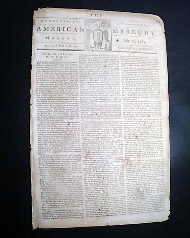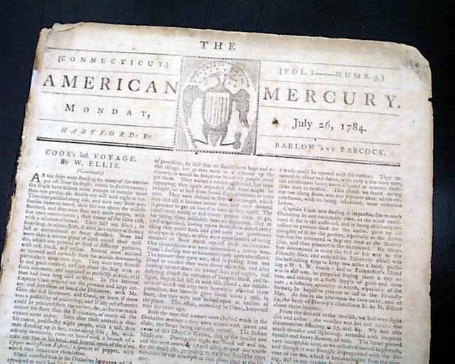 THE AMERICAN MERCURY, Hartford, Connecticut, July 26, 1784 This is the earliest date of this famous title we have offered, as its circulation was sizable during the early 19th century. This is the volume 1, number 3 issue.