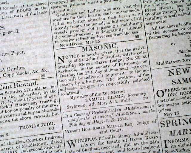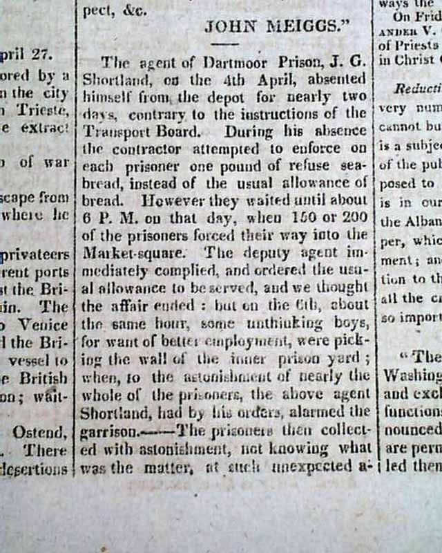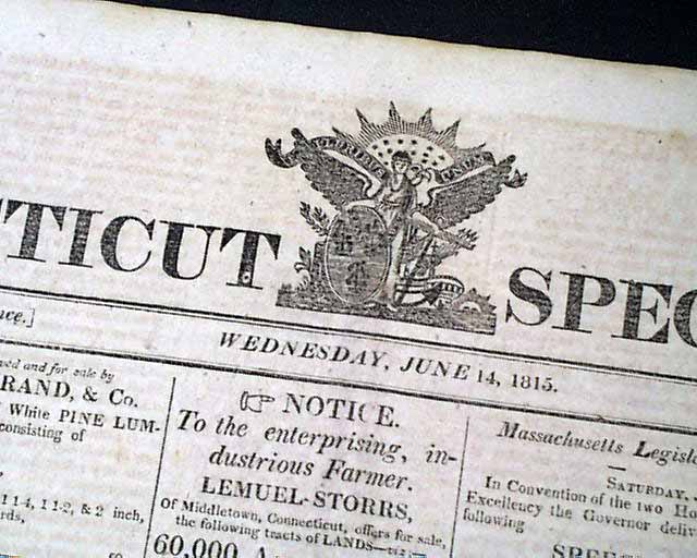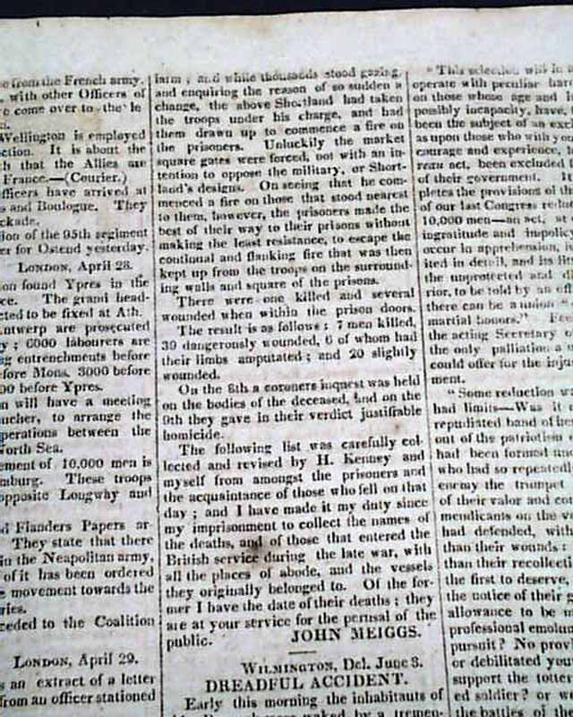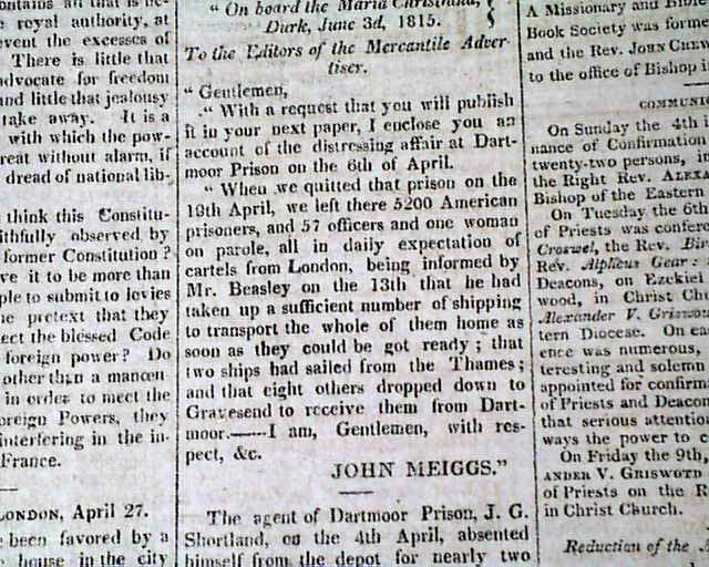 CONNECTICUT SPECTATOR, Middletown, June 14, 1815 Page 3 has a letter with an early report concerning the Dartmoor Massacre, noting in part: "...I enclose you an account of the distressing affair at Dartmoor Prison...When we quitted that prison...we left there 5200 American prisoners..." with more detail, all taking half a column.