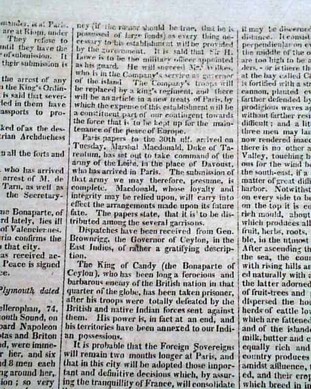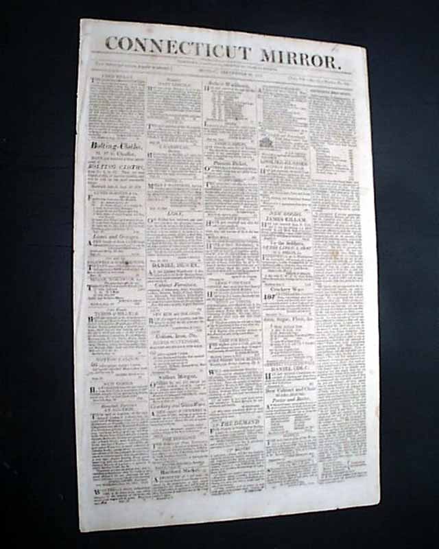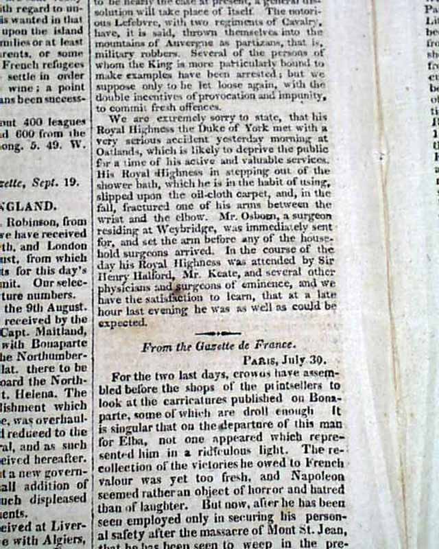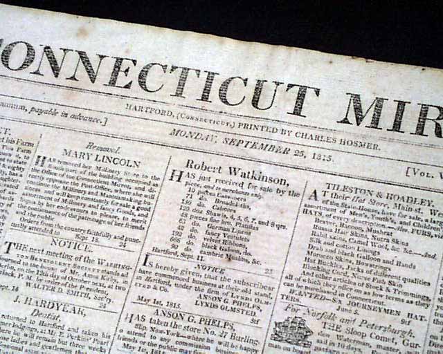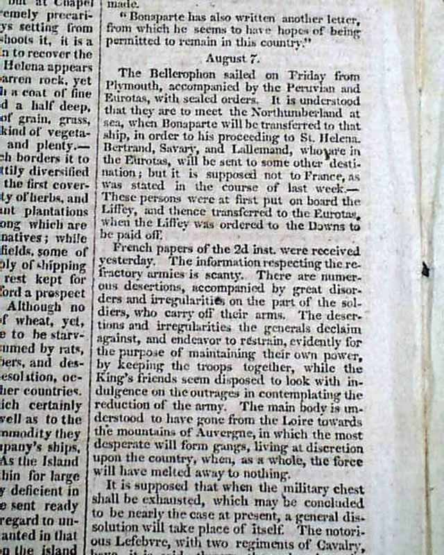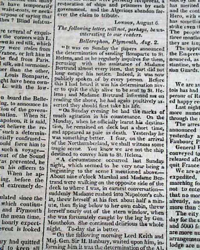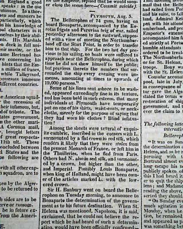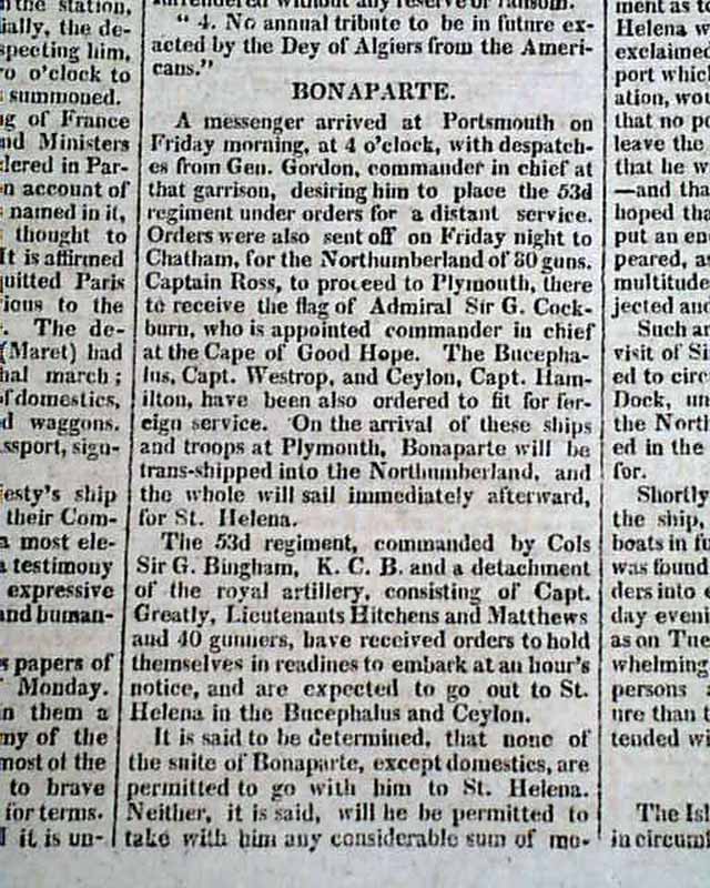 CONNECTICUT MIRROR, Hartford, Sept. 25, 1815 Page 2 has a number af articles concerning Napoleon Bonaparte and his banishment to the island of St. Helena. They include: "Bonaparte", and a report beginning: "The Bellerophon of 74 guns, having on board Bonaparte...' with more on his transport. Also a letter headed: "The Following letter will not, perhaps, be uninteresting to our readers" which is dated on the ship Bellerophon which holds Bonaparte. Yet another article concerning Bonaparte and his travels on the Bellerophon. See the photos for details.