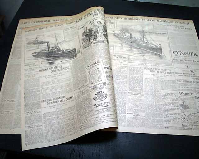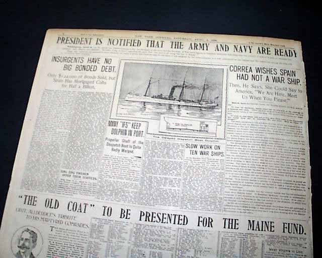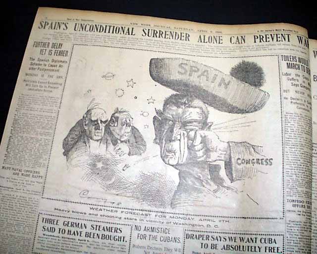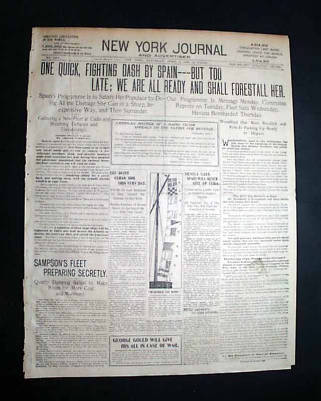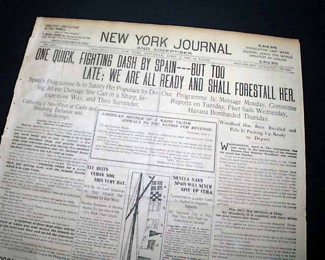 NEW YORK JOURNAL, April 9, 1898  A nice issue from the Spanish-American War with a banner headline: "ONE QUICK, FIGHTING DASH BY SPAIN---BUT TOO LATE; WE ARE ALL READY AND SHALL FORESTALL HER" with various subheads.