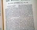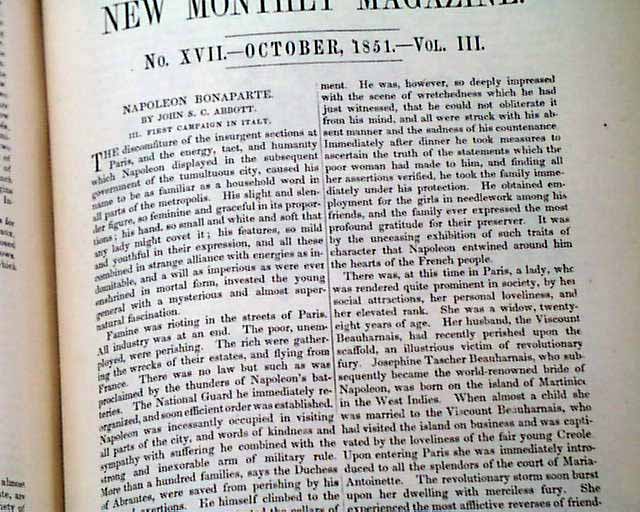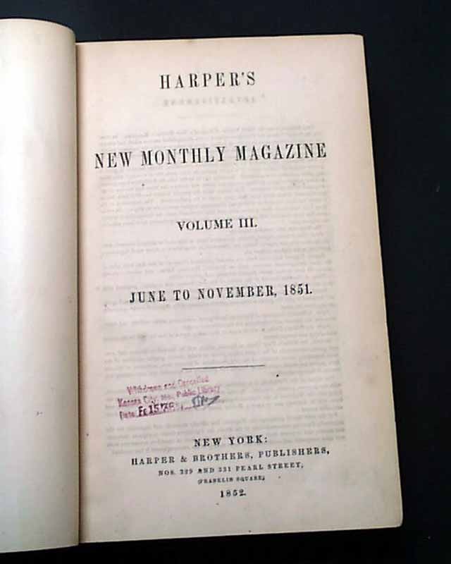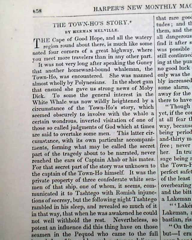 Item # 716139 HARPER'S MONTHLY MAGAZINE, New York, volume for May thruy November, 1851 The “Town Ho’s Story” appears on pages 659-665 in the October issue. It was the first appearance of any part of the great novel Moby Dick and became chapter 54 in the book. A publisher’s note on page 659 says: “From The Whale, the title of a new work by Mr. Melville, now in the press of Harper and Brothers, and now publishing in London by Mr. Bentley.”