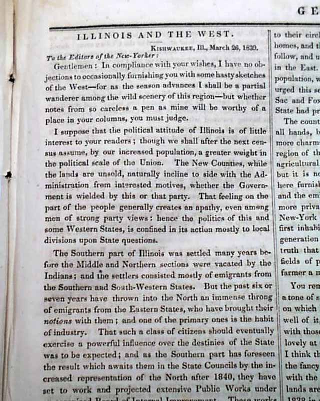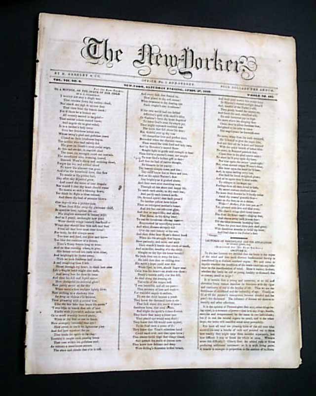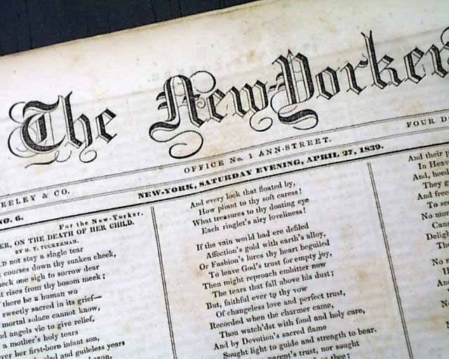 THE NEW-YORKER, April 27, 1839 This was published by the famed Horace Greeley, begun some 7 years before his more famous 'New York Tribune' would publish its first issue. Although he would work at several newspapers prior to the 'New Yorker', this would be his first successful venture, eventually reaching a circulation of 9,000.