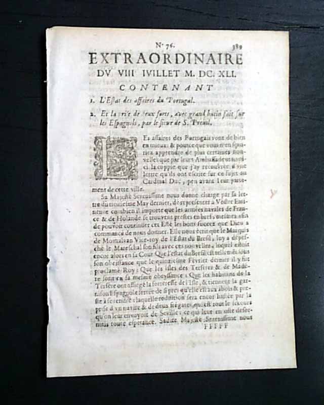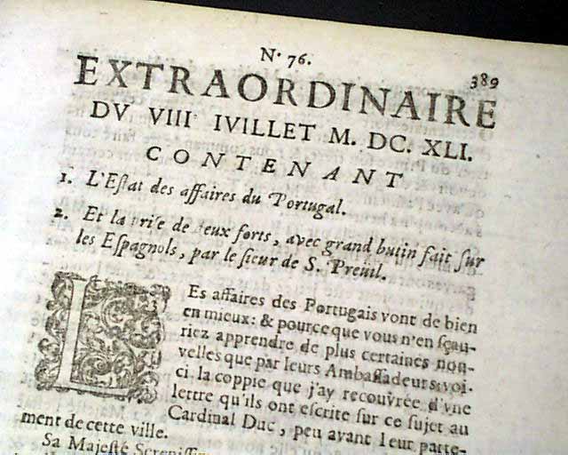 This issue published simultaneously along with the "Gazette" of Paris, the very first regular newspaper published in France which started 10 years previous in 1631 by Théophraste Renaudot but with influential backing by the powerful Cardinal de Richelieu.