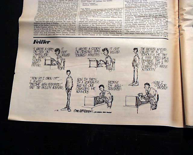 The Village Voice was an American counterculture newspaper known for being the country's first alternative newsweekly. It introduced free-form, high-spirited, and passionate journalism into the public discourse - a tradition it maintained throughout its 60+ year history. It is quite common to find great political cartoons, satirical cartoons and articles, thought-provoking editorials, and ads and reviews for both concerts and theater productions - both on and off Broadway. Many iconic writers and musicians credit their appearance in The Village Voice for at least a portion of their success.