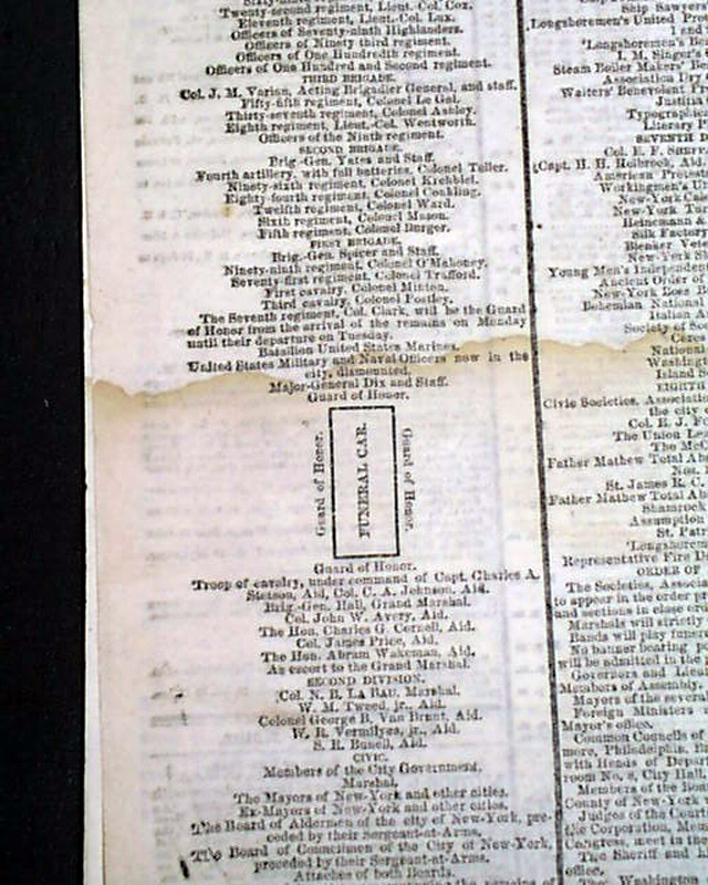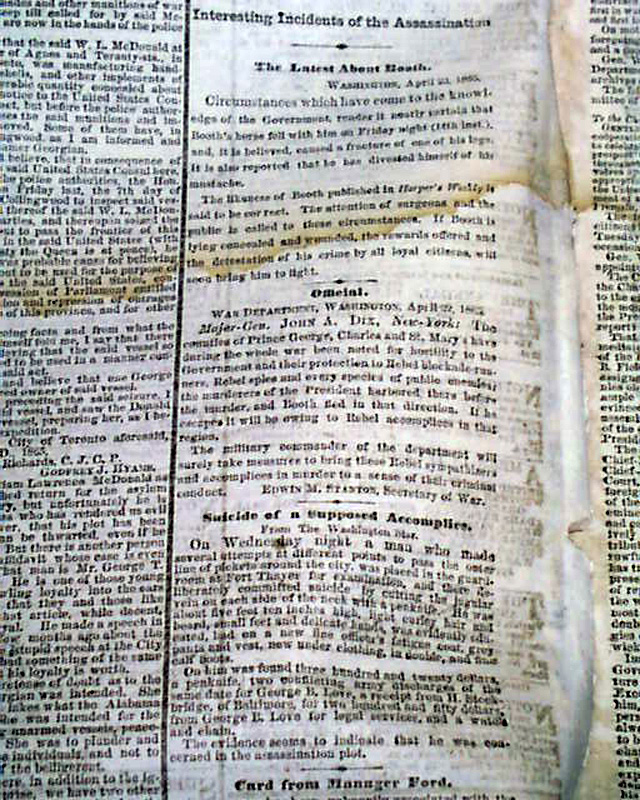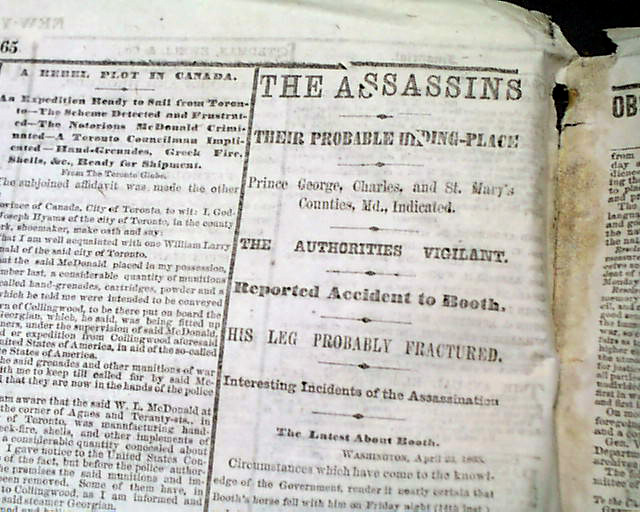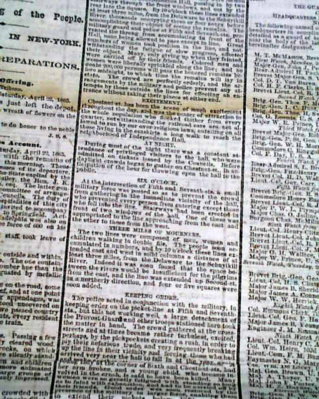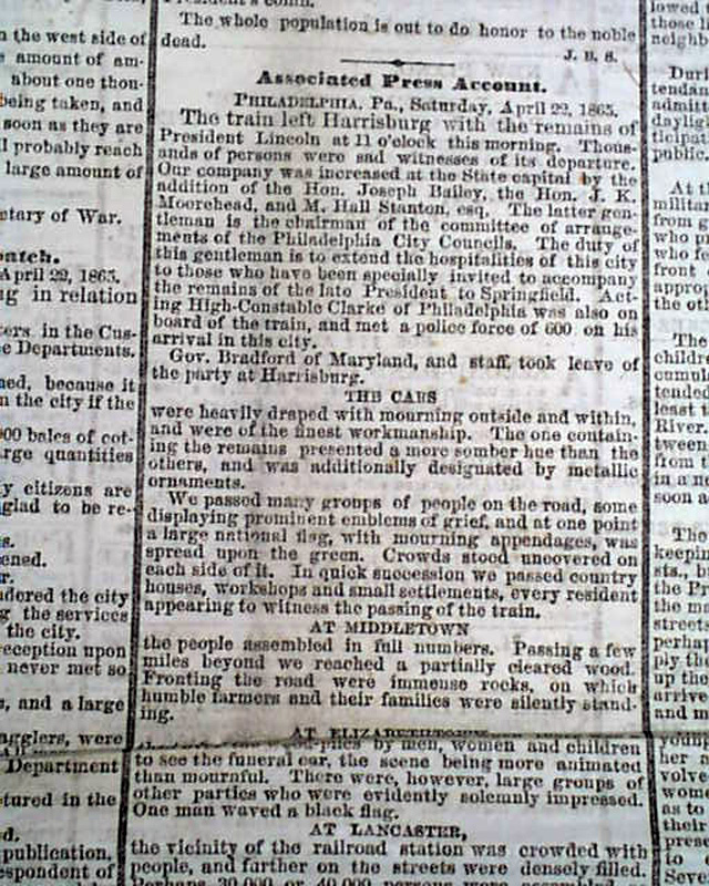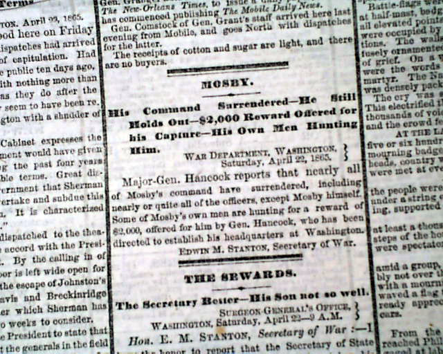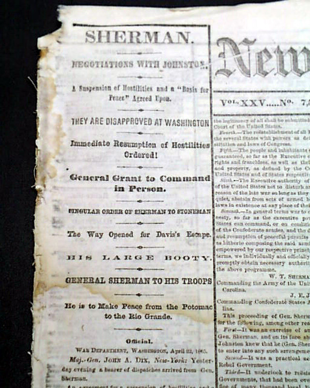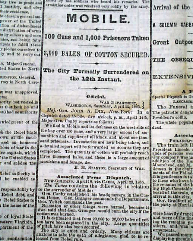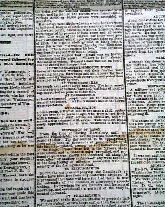 All columns on all pages are black-bordered for the death & funeral of Abraham Lincoln. Among the front page column heads are: "SHERMAN" "Negotiations With Johnston" "A Suspension of Hostilities..." "Immediate Resumption of Hostilities Ordered!" "The Way Opened for Davis's Escape" "His Large Booty" "MOBILE" "THE FUNERAL PAGEANT" "From Harrisburg to Philadelphia" "Scenes & Incidents on the Route" "Great Outpouring of the People" "Extensive Preparations" "Obsequies in the City" and more inside.