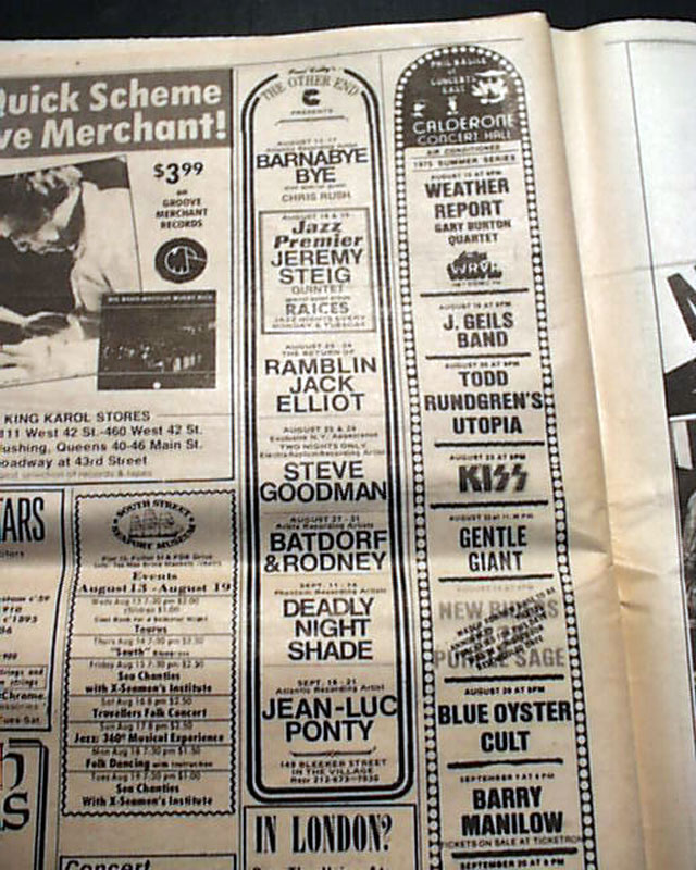 Page 92 has a advertisement for upcoming performances at the Calderone Concert Hall in Hempstead, Long Island with one of the performers being "KISS" on August 23rd. (see images)
