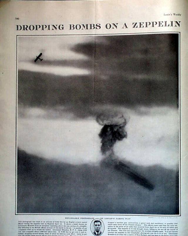 The front page is a color illustration: "The Moth and The Flame". Several articles related to WWI are present - including a full-page photo showing a plane dropping a bomb on a Zeppelin, along with period ads for products such as Republic Motor Trucks, Columbia Records, REO Motor Car Company, Good Year Tires, and more.