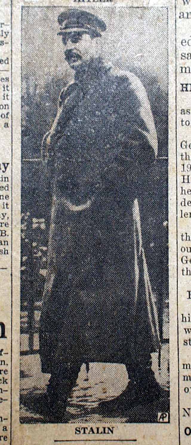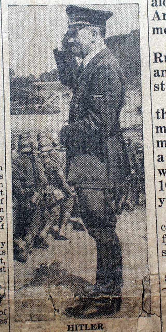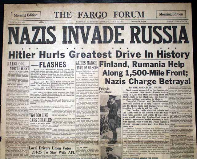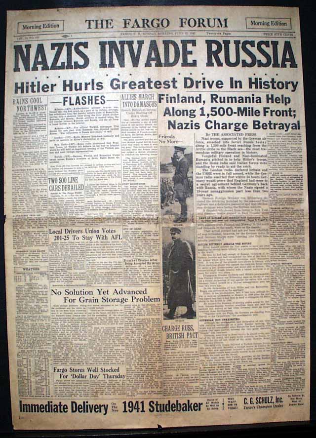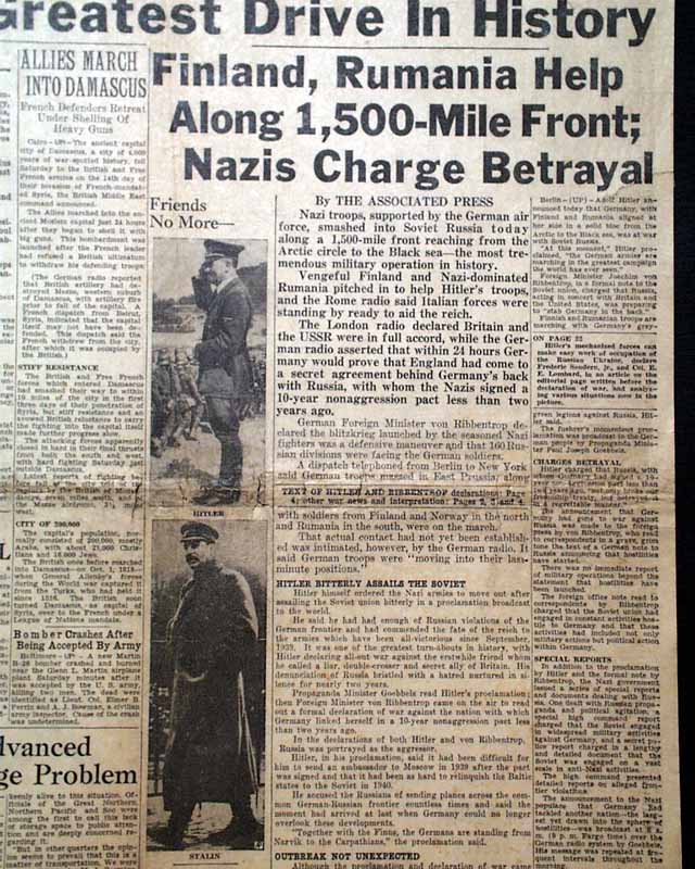 The front page has a dramatic banner headline: "NAZIS INVADE RUSSIA", with subheads: "Hitler Hurls Greatest Drive in History" and "Finland, Rumania Help Along 1,500-Mile Front; Nazis Charge Betrayal", with supporting text. Also included are photos of both Adolf Hitler and Joseph Stalin.