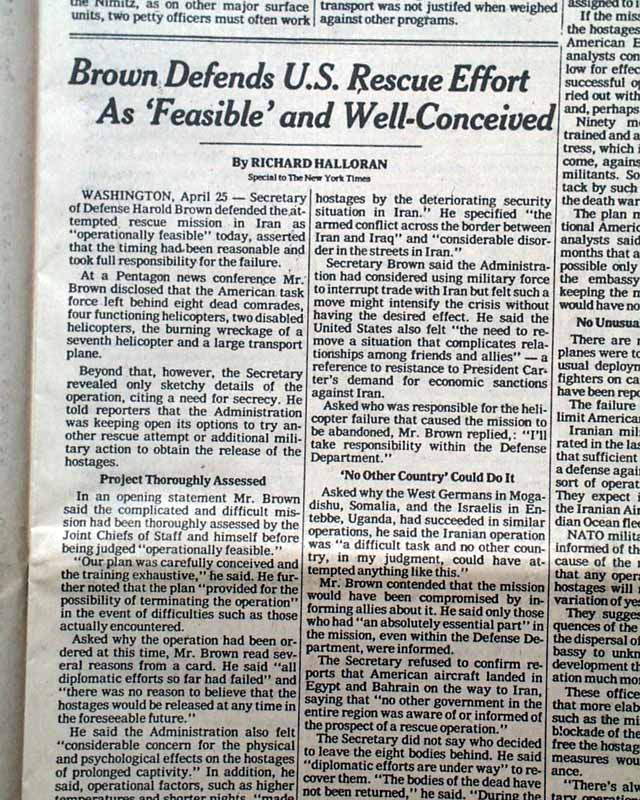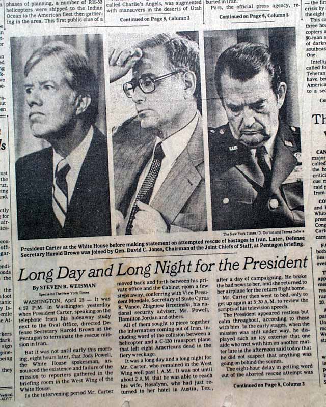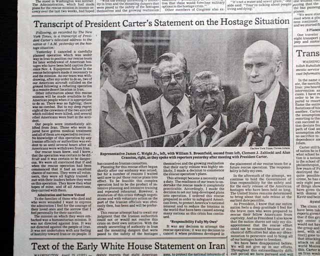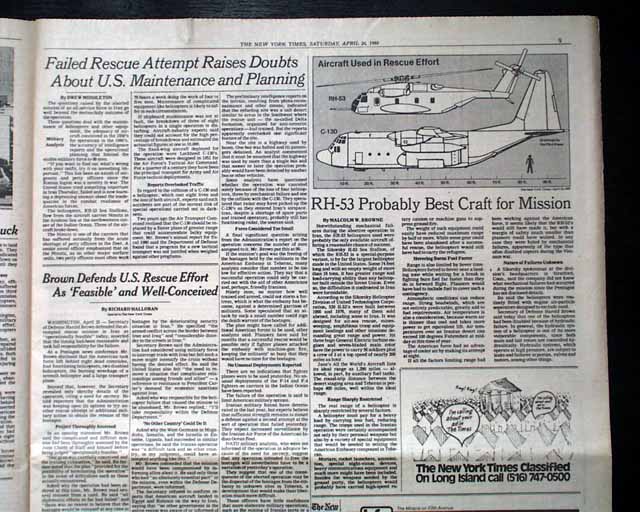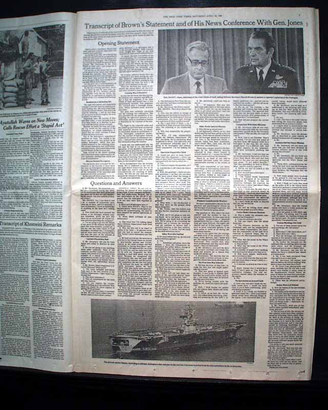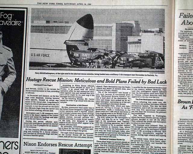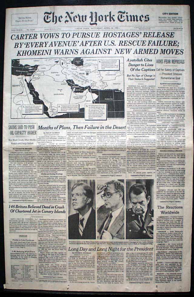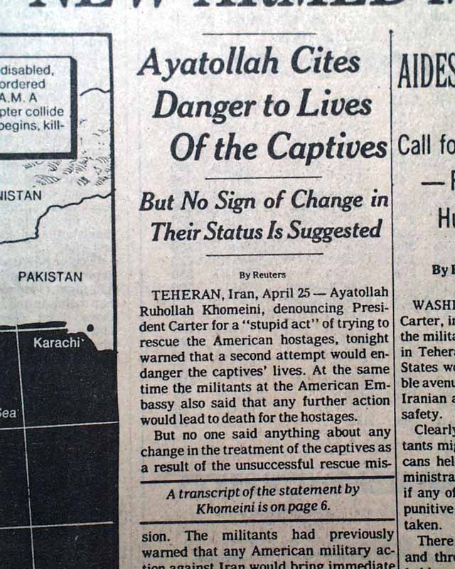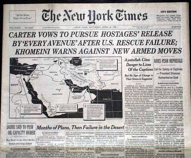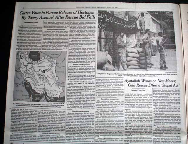 The front page has the dramatic 3-line banner heading: "CARTER VOWS TO PURSUE HOSTAGES' RELEASE BY 'EVERY AVENUE' AFTER U.S. RESCUE FAILURE; KHMEINI WARNS AGAINST NEW ARMED MOVES", with subheadings: "Ayatollah Cites Danger to Lives Of the Captives", "Aides Fear Reprisals", "Months of Plans, Then Failure in the Desert", and more. They are all accompanied by a large map of the region. Inside pages have extensive coverage with additional photos. See images for details.