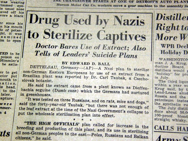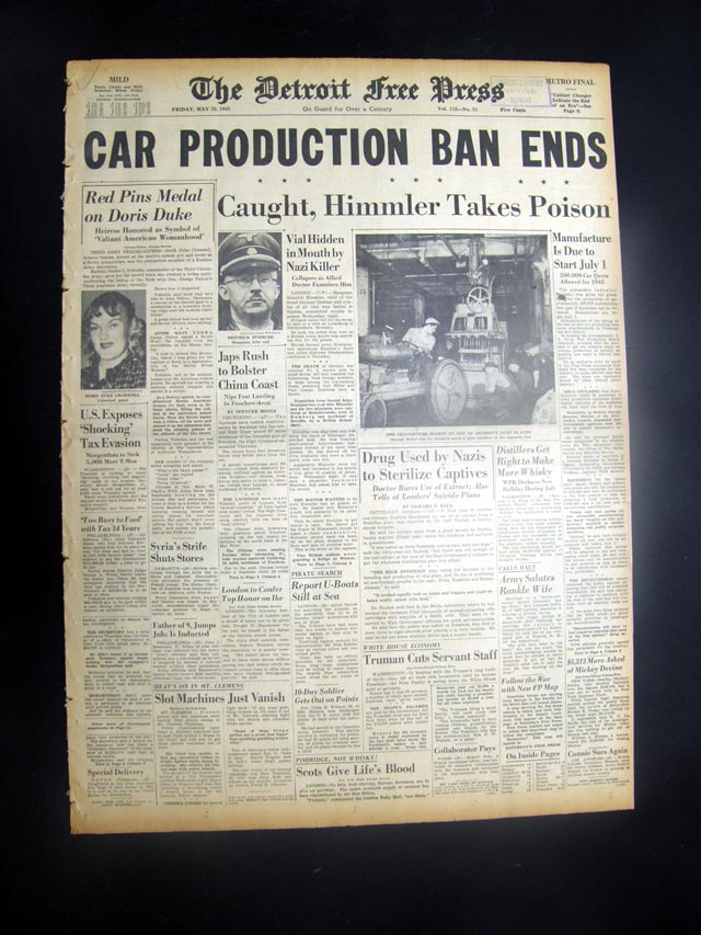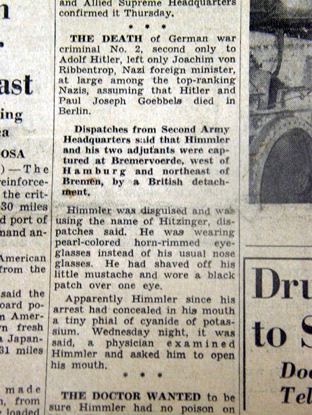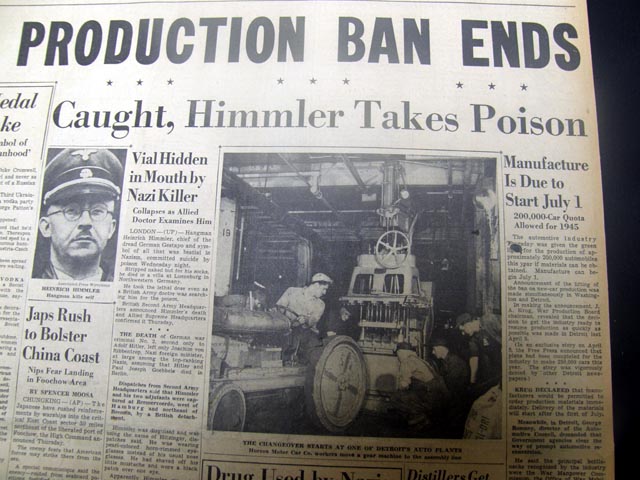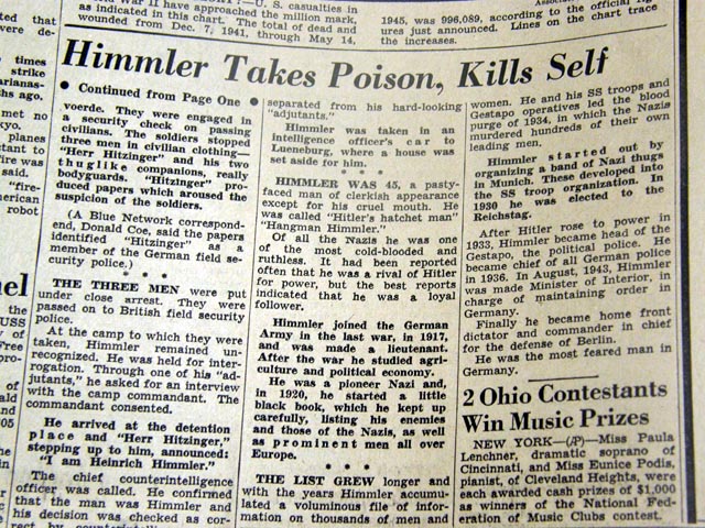 The front page has a six column heading: "Caught, Himmler Takes Poison" with subheads: "Vial Hidden in Mouth by Nazi Killer" "Collapses as Allied Doctor Examines Him". The article is accompanied by a photo of Himmler and continues on an inside page.