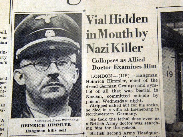 AI notes: Heinrich Himmler, Reichsführer-SS and one of the most powerful figures of Nazi Germany, committed suicide on 23 May 1945 while in British custody. After the German surrender, he attempted to evade capture by disguising himself as a regular soldier under a false identity. He was apprehended near Bremervörde in northern Germany and eventually brought to a British interrogation center in Lüneburg. During a routine medical examination, Himmler bit down on a concealed cyanide capsule hidden in his mouth, killing himself almost instantly. Despite efforts by British doctors, he could not be revived. His death denied the Allies the chance to publicly try him for war crimes at Nuremberg, where his role in orchestrating the Holocaust and other atrocities would have made him one of the chief defendants. His body was buried in an unmarked grave, the location of which remains unknown.