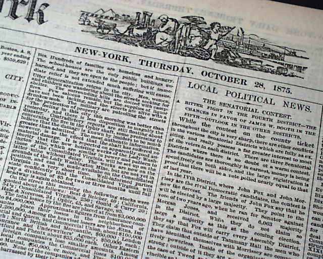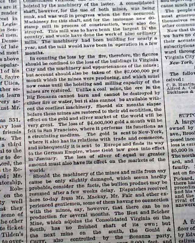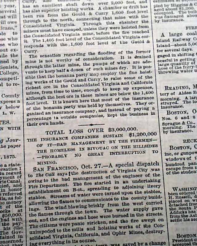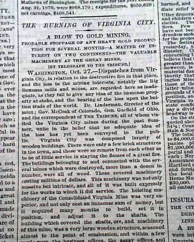 NEW YORK TRIBUNE, Oct. 28, 1875 The front page has 1 1/2 columns taken up with considerable detail on what is known as the Virginia Great Fire of 1875, a quite notable event in the history of Virginia City.