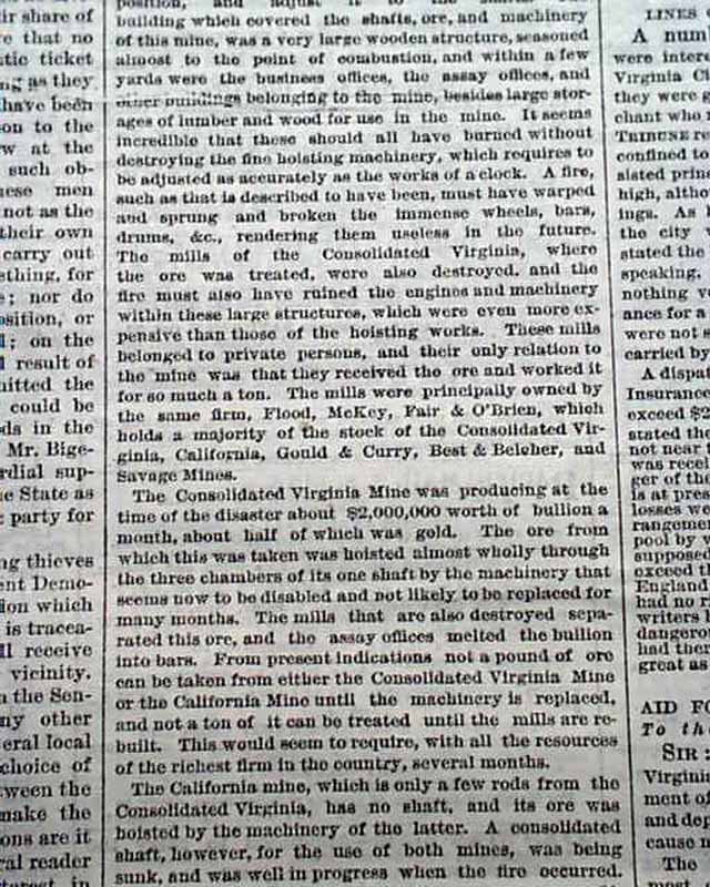 The column heads include: "The Burning Of Virginia City" "A Blow to Gold Mining" "Probable Stoppage of Any Heavy Gold Production for Several Months..." "Total Loss Over $3,000,000..." "Insurance Losses In New York Small" "Aid For The Inhabitants of Virginia City" plus more.