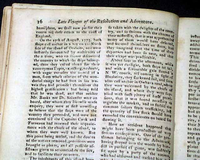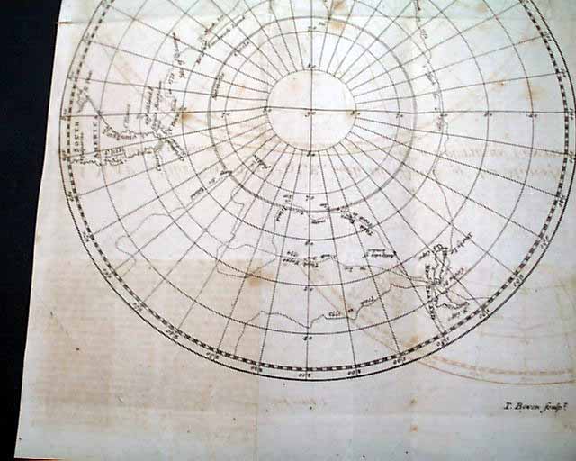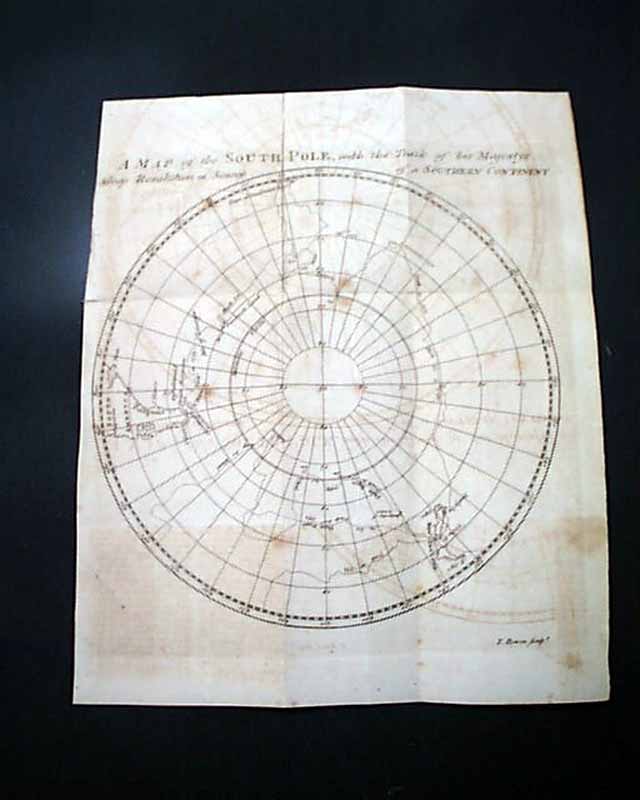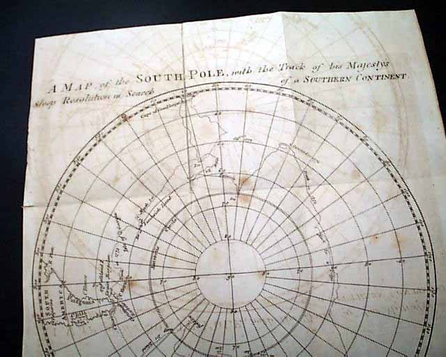 Included also is a nice article on the: "Journal of the Resolution's Voyage of Discovery to the Southern Hemisphere" which was Captain James Cook's voyage, the text taking over 4 pages. It is accompanied by a very nice foldout map titled: "A Map of the South Pole, with the Track of His Majesty's Sloop Resolution in Search of the Southern Continent". This map measures 9 1/4 by 11 1/4 inches, some light foxing, and some ink-offsetting from having been folded into itself for nearly 250 years. Good condition.