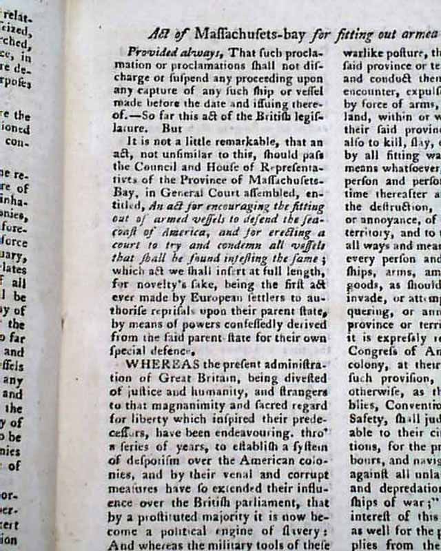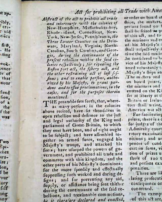 Included are two pages on an: "Act for Prohibiting all Trade with America" which is followed by an: "Act of Massachusetts Bay for Fitting out Armed Vessels" which takes 3 pages.