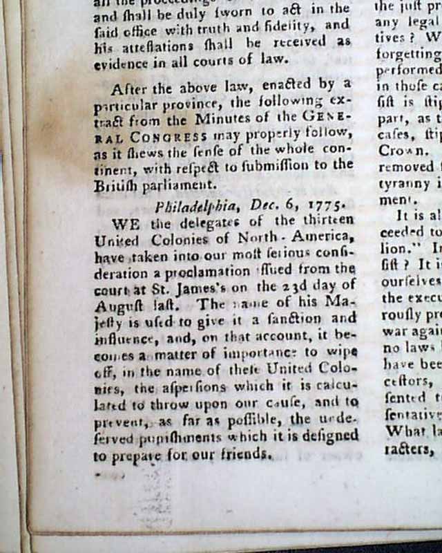 Also reported here is a: "Declaration of the Continental Congress on a late Proclamation" from England, datelined Philadelphia, Dec. 6, 1775, being their heated response to the King declaring the colonies to be in a state of open rebellion.